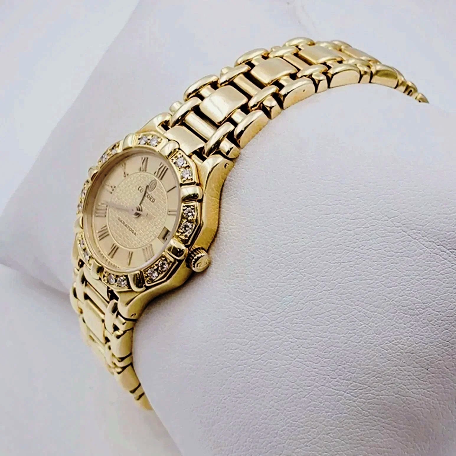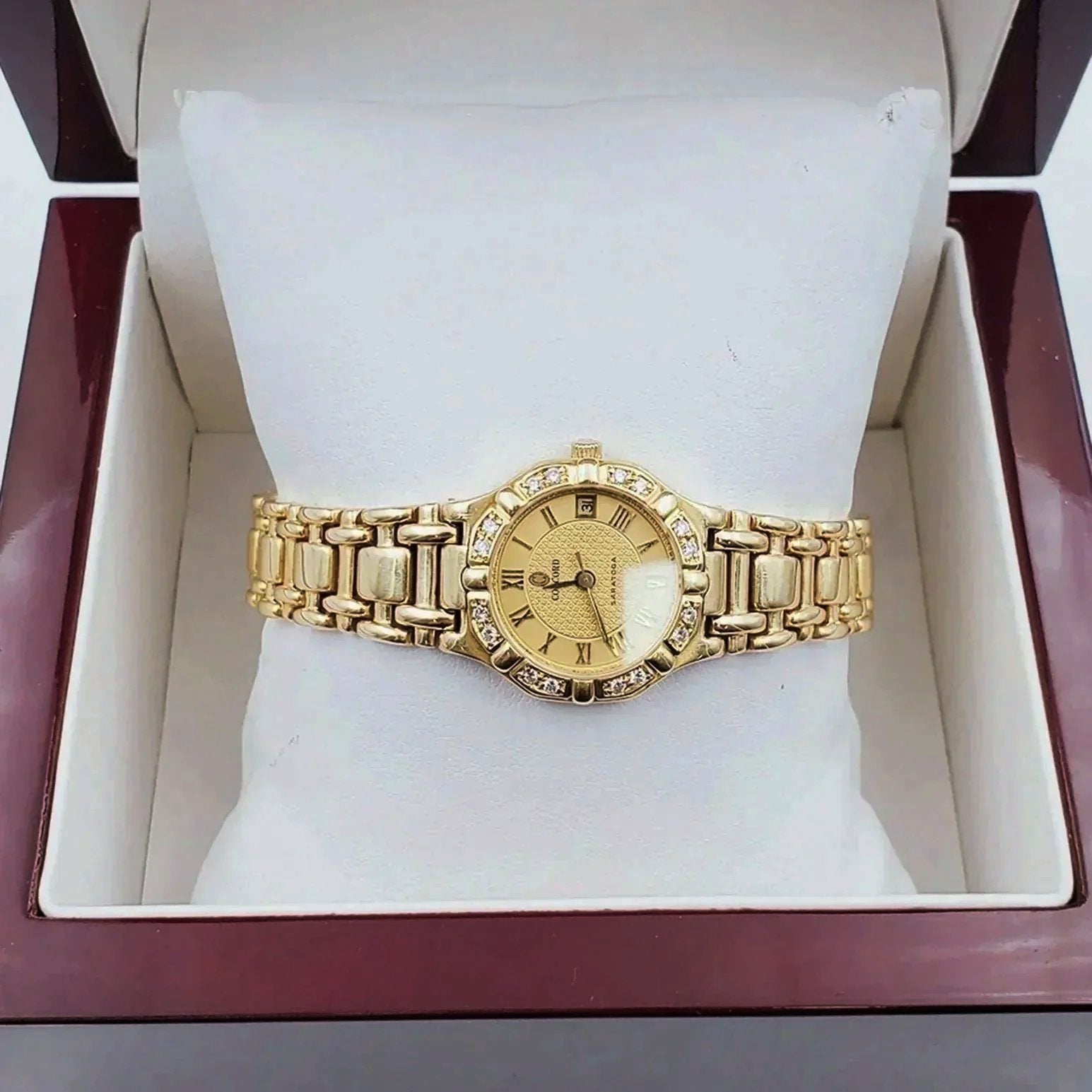 Women's Concord Sarento 24mm Solid 18K Yellow Gold Band Watch with Roman Numeral Gold Dial and Diamond Bezel. Includes Mahogany Box.
