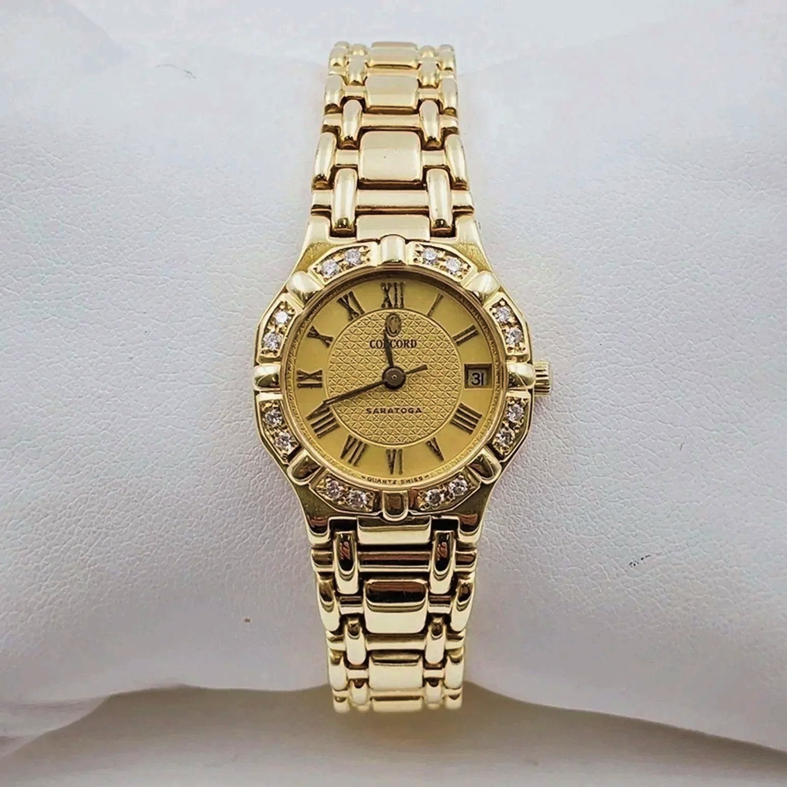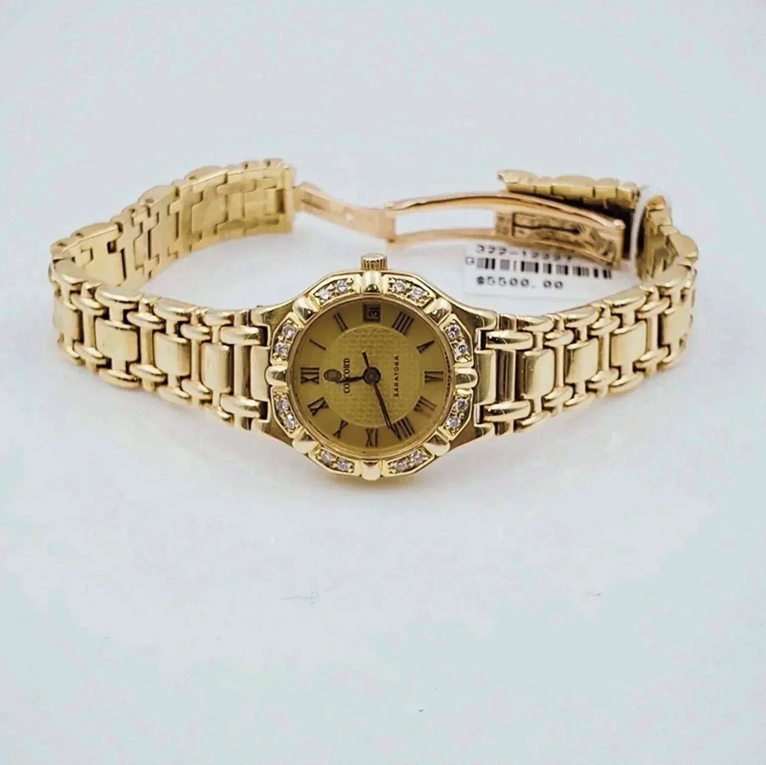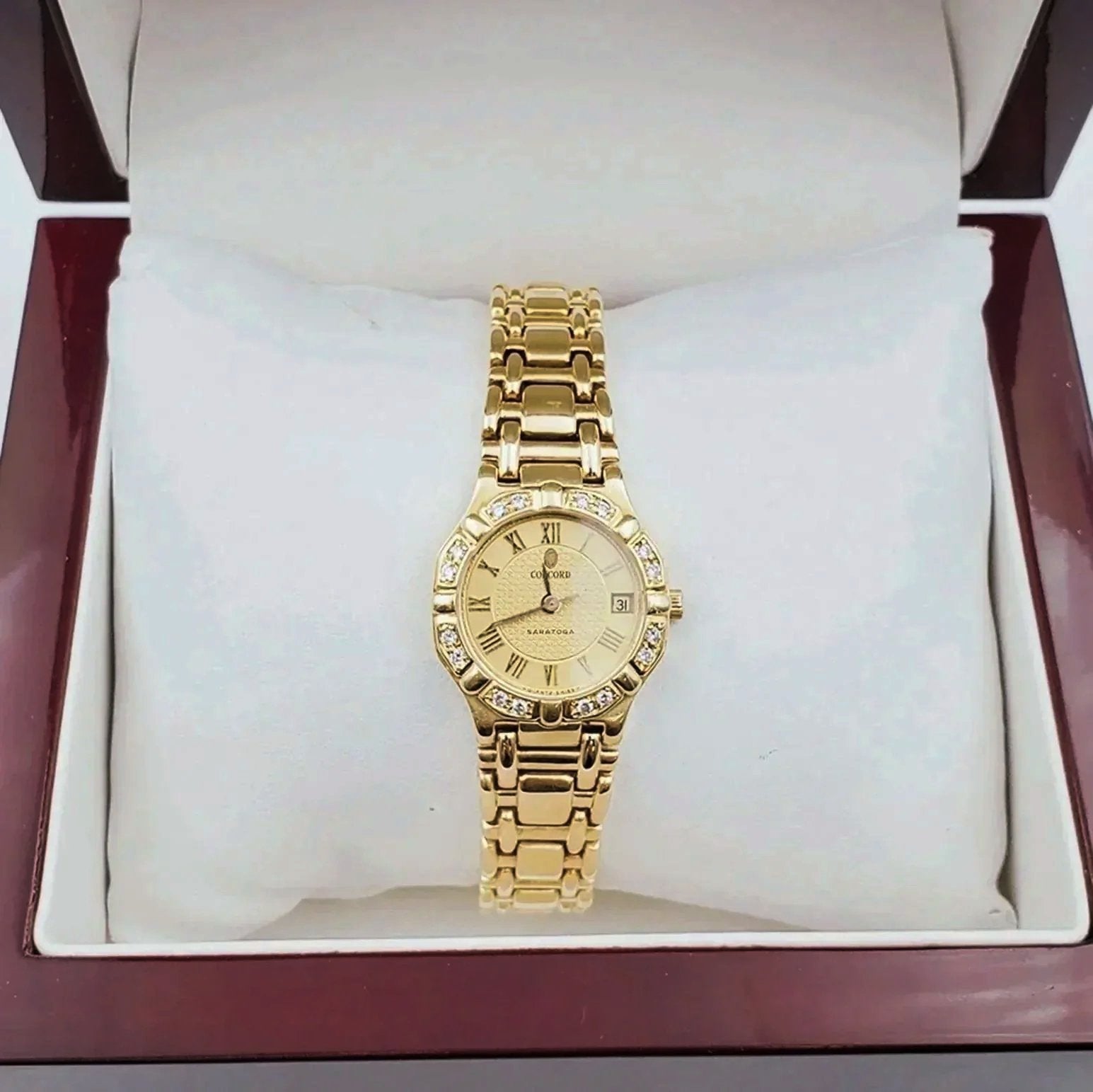Women's Concord Sarento 24mm Solid 18K Yellow Gold Band Watch with Roman Numeral Gold Dial and Diamond Bezel. Includes Mahogany Box. Brand: Concord. Case Back: Solid. Gender: Women's. Condition: Pre-Owned. Dial Color: Yellow Gold. Case Dimensions: 24mm. Total Weight: 57.3 Grams. Bracelet Size: 6.5 (inches). Bracelet / Strap: Solid Gold. Bezel Color: 18K Yellow Gold. Condition: Excellent Condition. Movement: Quartz (Movement). Metal Type: 18K Gold Solid Gold. Warranty: 1 Year Limited Warranty.