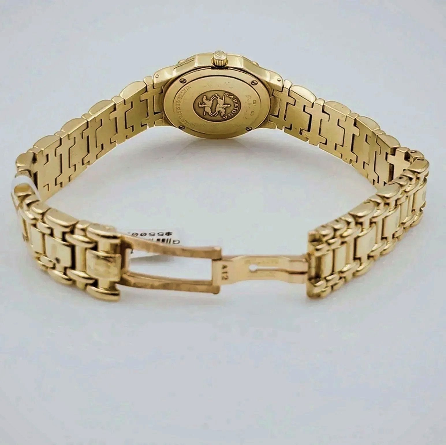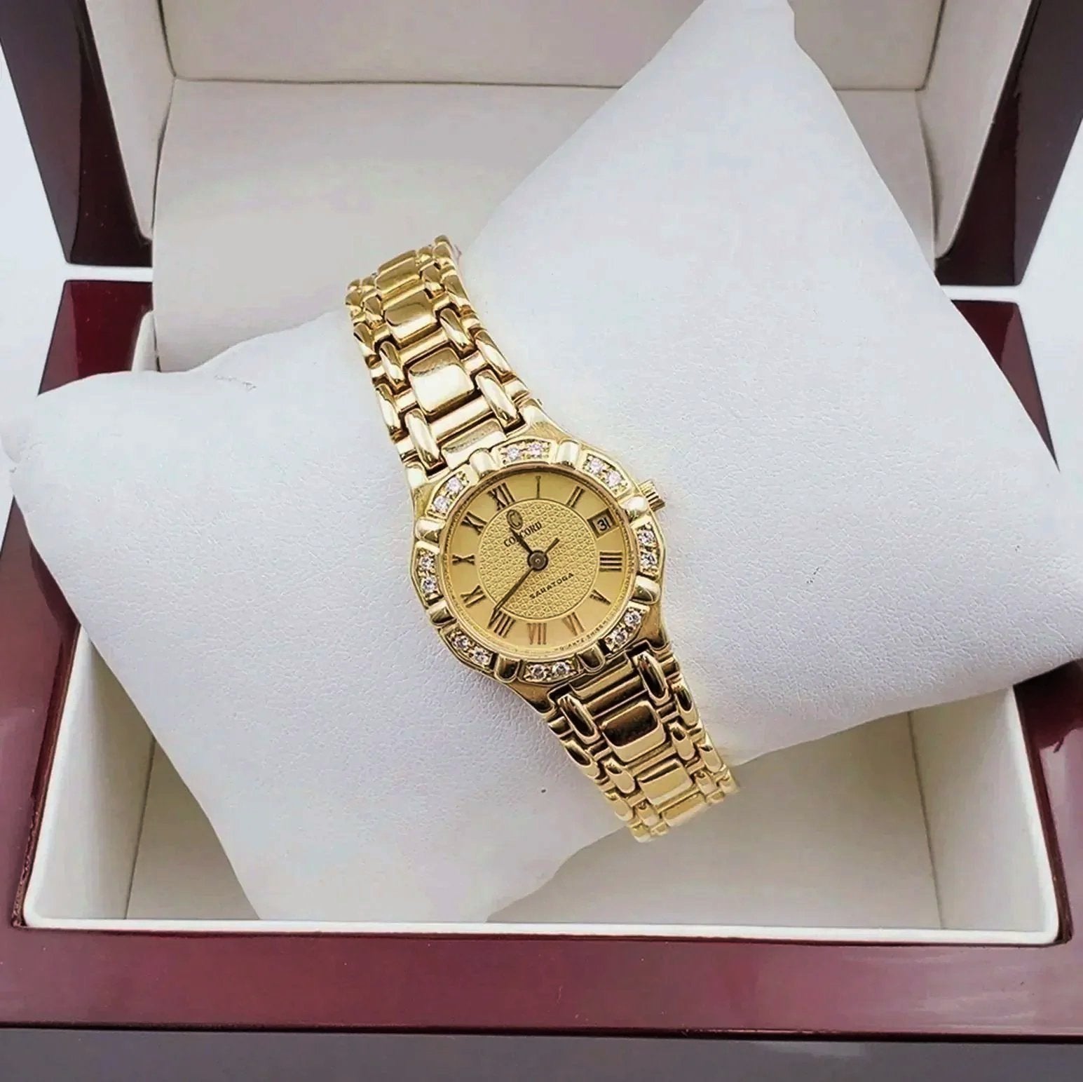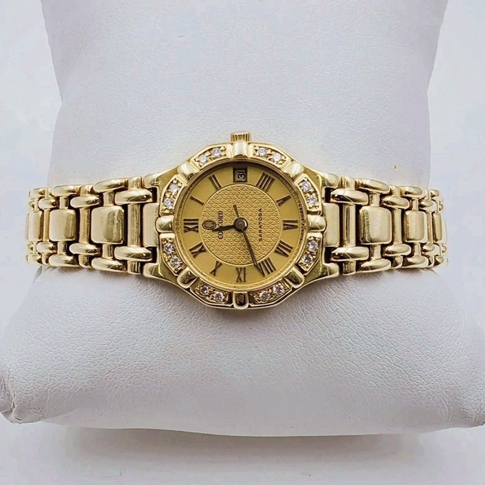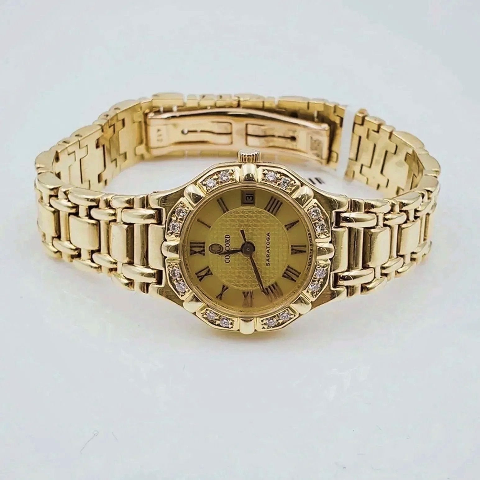 Women's Concord Sarento 24mm Solid 18K Yellow Gold Band Watch with Roman Numeral Gold Dial and Diamond Bezel. Includes Mahogany Box. Brand: Concord. Case Back: Solid. Gender: Women's. Condition: Pre-Owned. Dial Color: Yellow Gold. Case Dimensions: 24mm. Total Weight: 57.3 Grams. Bracelet Size: 6.5 (inches). Bracelet / Strap: Solid Gold. Bezel Color: 18K Yellow Gold. Condition: Excellent Condition. Movement: Quartz (Movement). Metal Type: 18K Gold Solid Gold. Warranty: 1 Year Limited Warranty.
