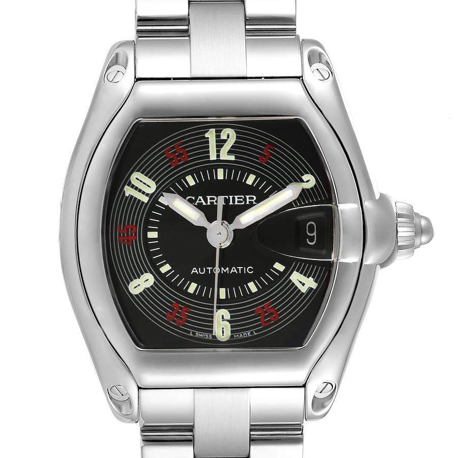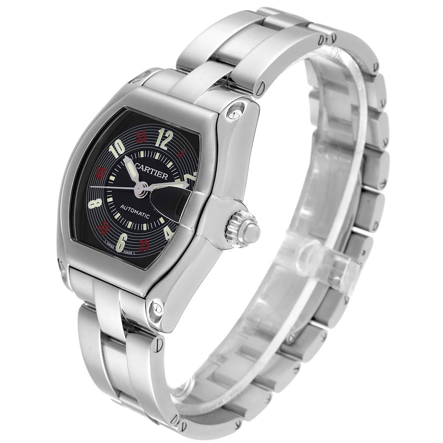 • Features: This Cartier Roadster features a stainless steel case and bracelet, with a smooth bezel and hidden folding clasp. The dial features Arabic numeral markers and a black Vegas roulette red/green design. It is water resistant and has a mechanical (automatic) movement. The case size is 38mm x 43mm and the model/style is Roadster. The hands are white and the crystal is sapphire. The condition is excellent and it comes with an aftermarket mahogany box and a one-year limited service warranty.