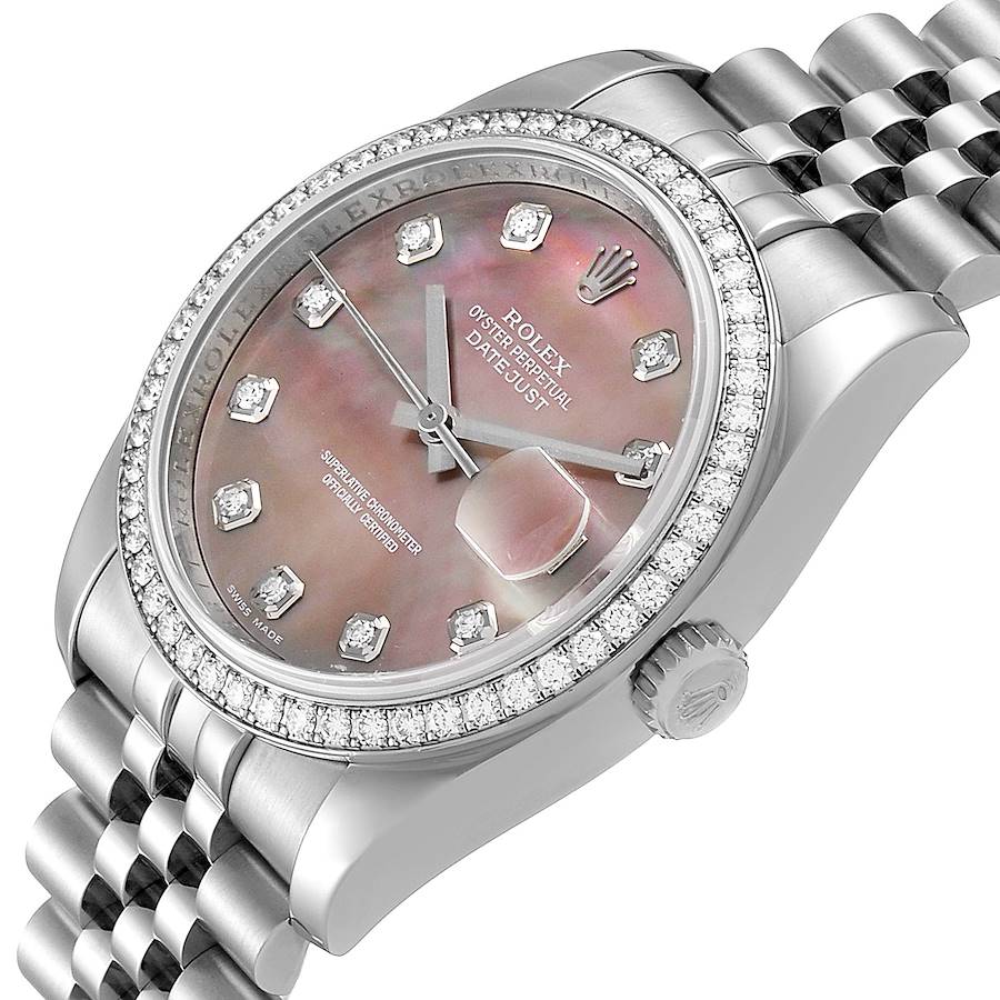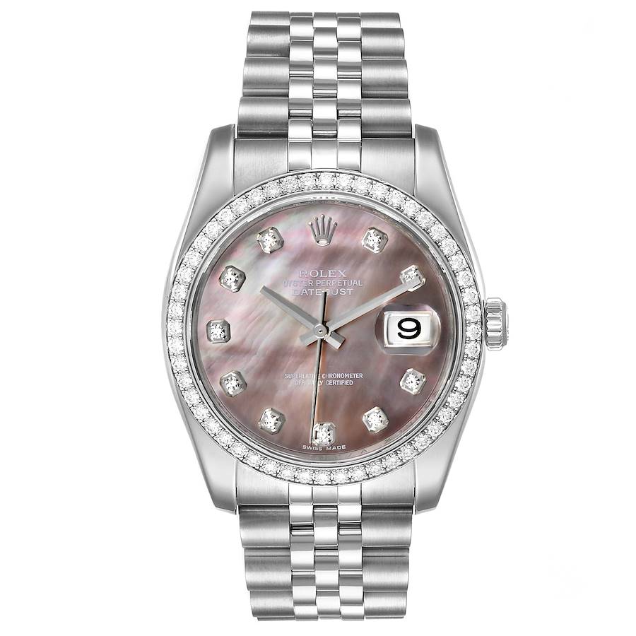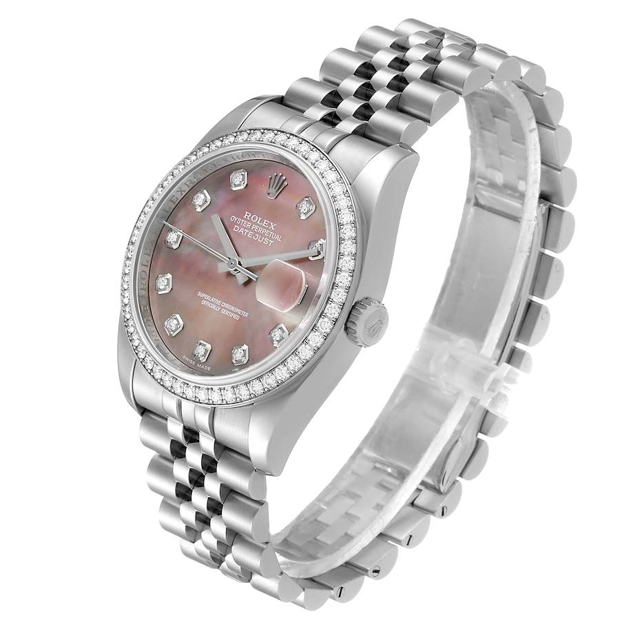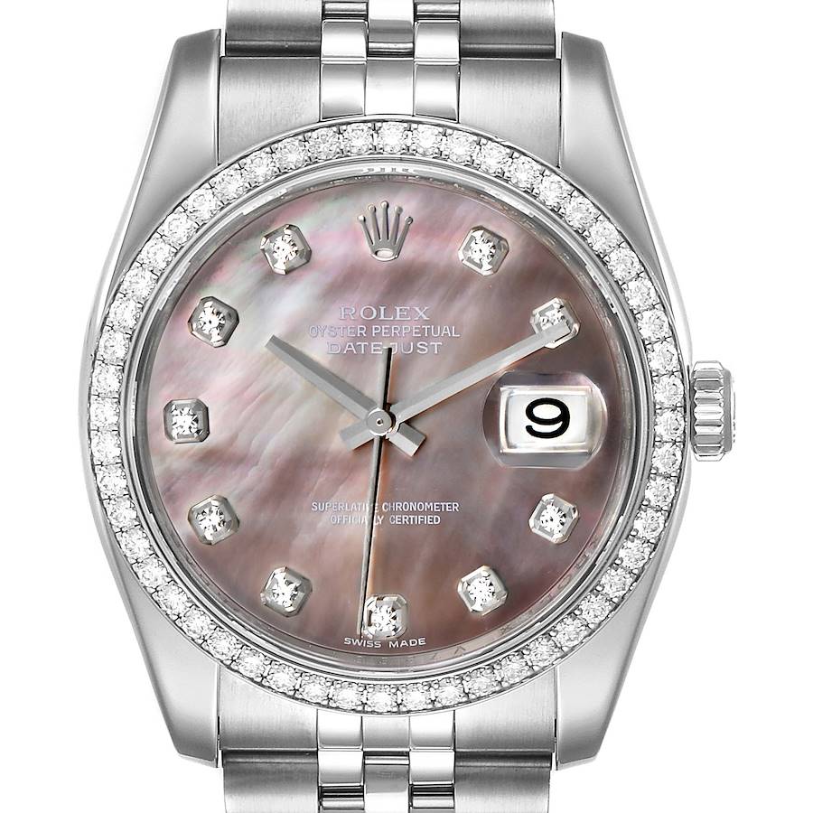 *Men's Rolex 36mm DateJust Stainless Steel Watch with Mother of Peal Diamond Dial and Diamond Bezel. (Pre-Owned Box/Card 116244)