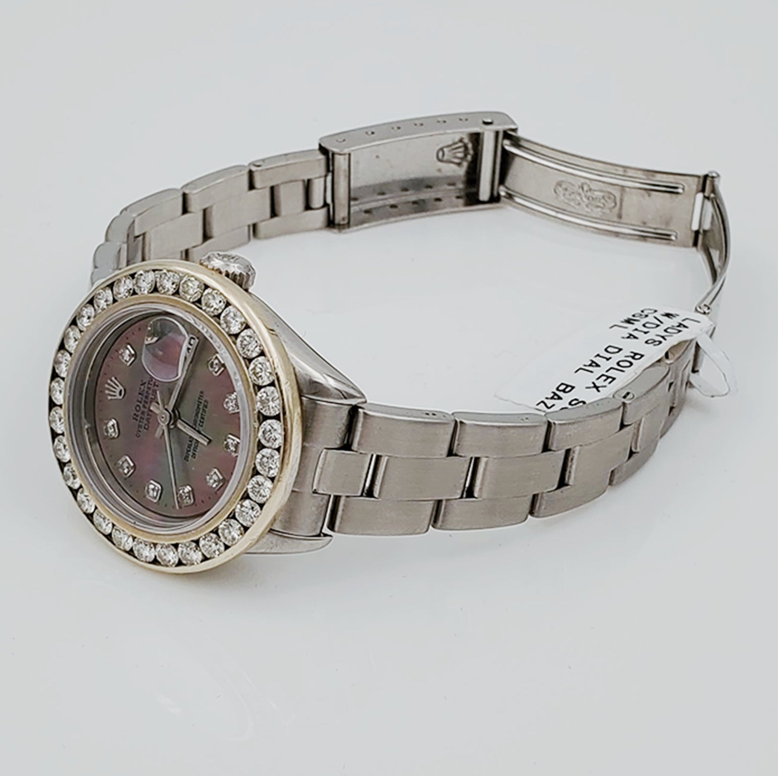 Women's Rolex 26mm DateJust Stainless Steel Watch with Mother of Pearl Black Diamond Dial and Custom Diamond Bezel.