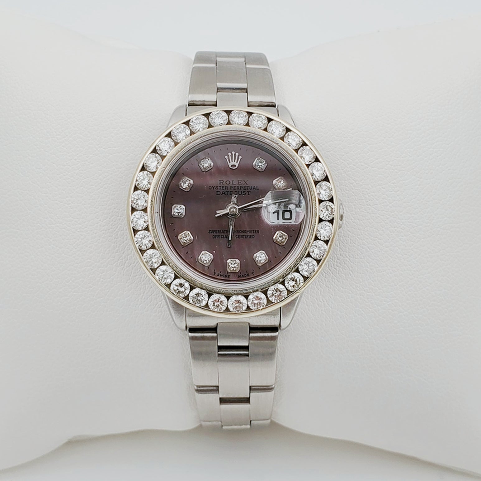 Women's Rolex 26mm DateJust Stainless Steel Watch with Mother of Pearl Black Diamond Dial and Custom Diamond Bezel. Pre-Owned Brand: Rolex. Crystal: Sapphire. Gender: Women's. Dial: Diamond Dial. Bezel: Diamond Bezel. Movement: Self-Winding. Case Dimensions: 26mm. Metal Type: Stainless Steel. Dial Color: Mother of Pearl Black Dial. Bracelet: Oyster Bracelet / Stainless Steel. Box / Certificate: Rolex Box / Certificate of Authenticity. Service Warranty: One (1) Year Limited Service Warranty. NOTE: This beautiful Rolex watch includes an aftermarket custom diamond bezel.