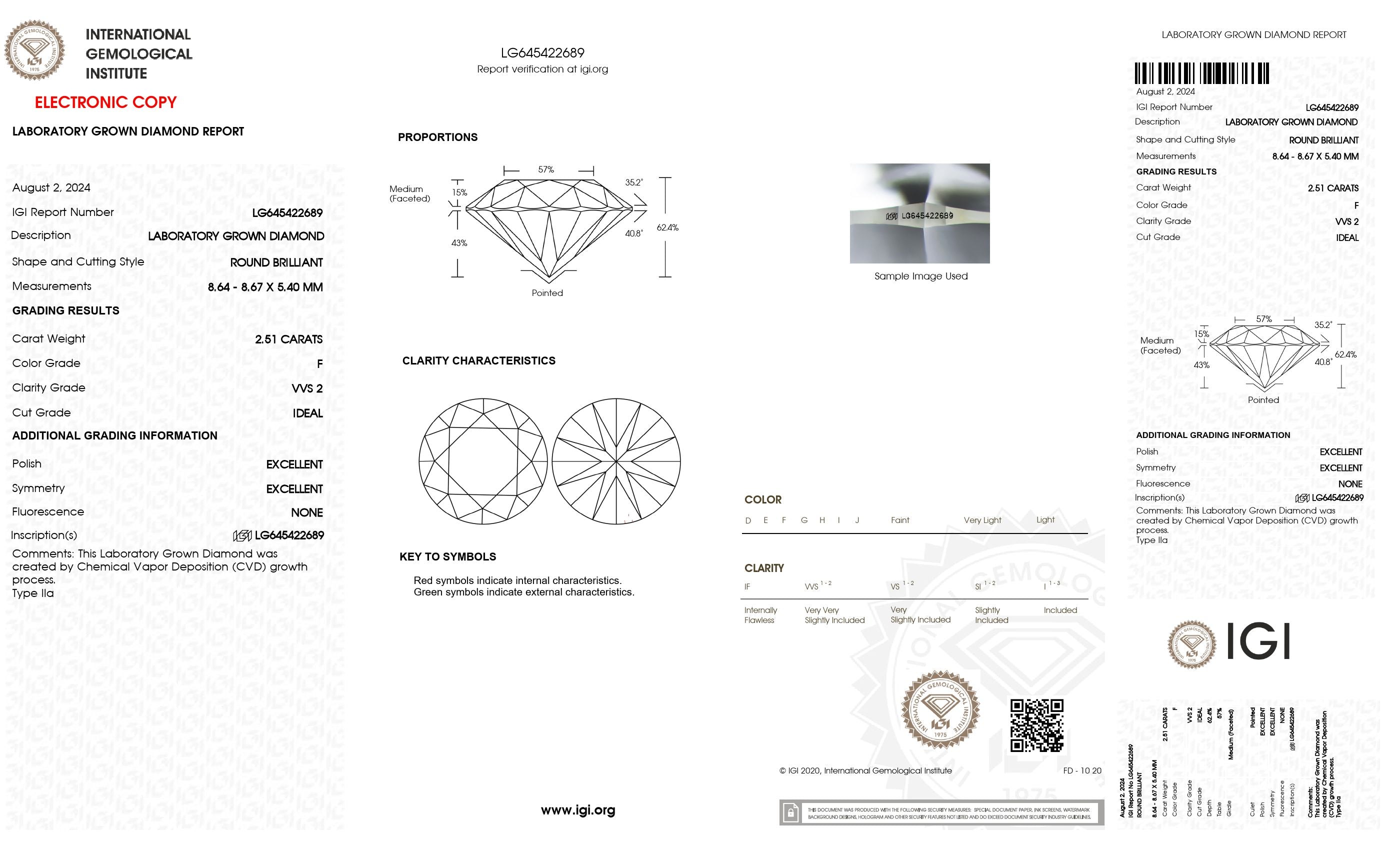2.51 Ct. Round Wholesale IGI Certified Lab Grown Loose Diamond. (Clarity VVS2 / F Color)