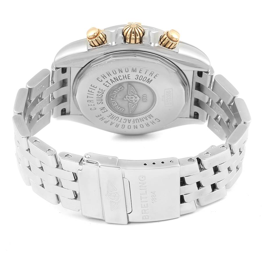 Men's Breitling 40mm 18K Yellow Gold / Stainless Steel Watch with Black Chronograph Dial. Dial: Black. Gender: Men's. Brand: Breitling. Clasp: Fold Clasp. Condition: Excellent. Case Material: Steel. Clasp Material: Steel. Movement: Automatic. Case Diameter: 44mm. Crystal: Sapphire Crystal. Bracelet Material: Steel. Dial Numerals: No Numerals. Movement/Caliber: Breitling. Case Material: Stainless Steel. Bezel Material: 18K Gold / Stainless Steel. Box: Includes Aftermarket Mahogany Box. Bracelet Material: 18K Yellow Gold / Stainless Steel. Warranty: One (1) Year Limited Service Warranty.