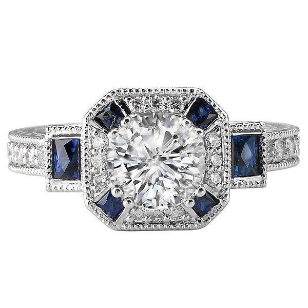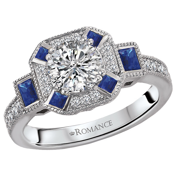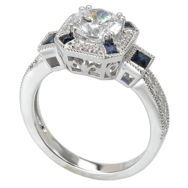 Sapphire and Diamond Ring with Milgrain Detail in 14kt White Gold. (D.1/4 carat weight, Sapp 3/8 carat weight) This item is a SEMI-MOUNT and it comes with NO CENTER STONE as shown but it will accommodate a 6.5mm round center stone.