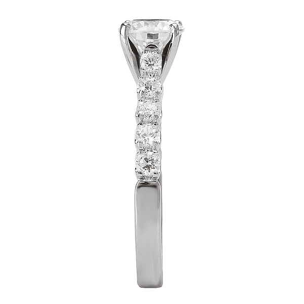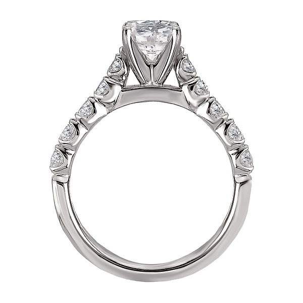 Micro-set round diamond ring in 14kt white gold with a 14K peg head center. (D. 3//8 carat total weight) This item is a SEMI-MOUNT and it comes with NO CENTER STONE as shown but it will accommodate a 6.5mm round center stone. Peg Head
