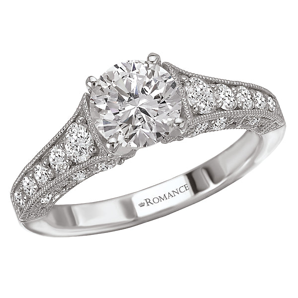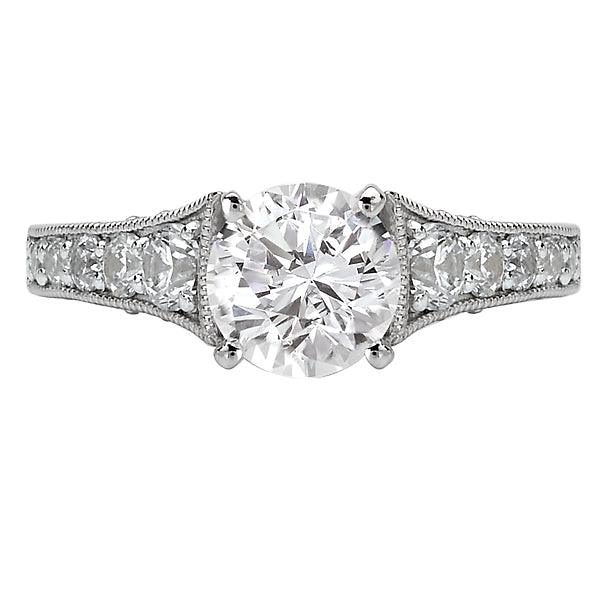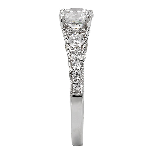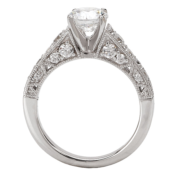 Graduated diamond ring in 14kt white gold with a 14kt peg head center. (D 3/4 carat total weight) This item is a SEMI-MOUNT and it comes with NO CENTER STONE as shown but it will accommodate a 6.5mm round center stone.