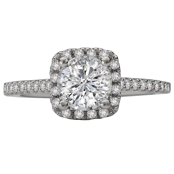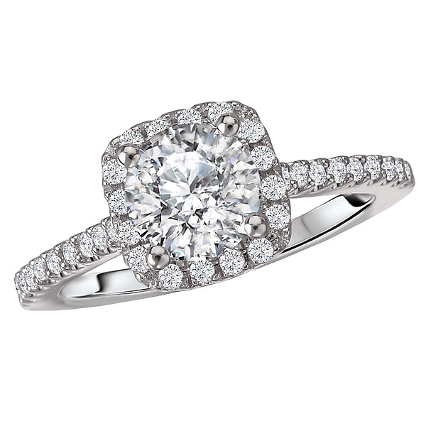 Cushion Shaped Halo Diamond Ring in 14kt White Gold. (D 1/4 carat total weight) This item is a SEMI-MOUNT and it comes with NO CENTER STONE as shown but it will accommodate a 6.5mm round center stone.