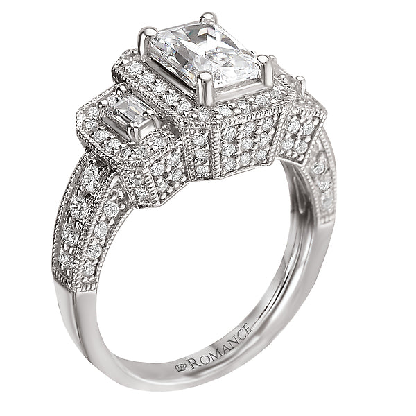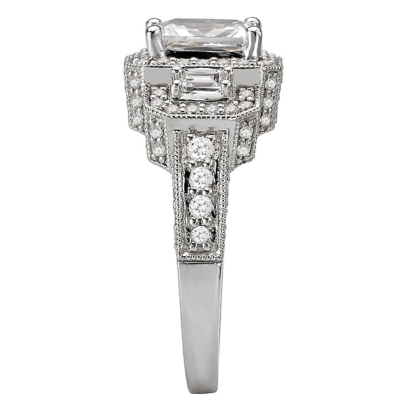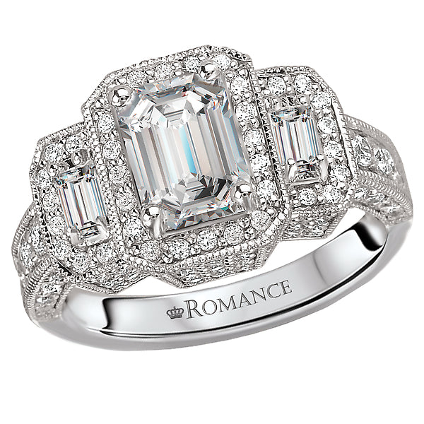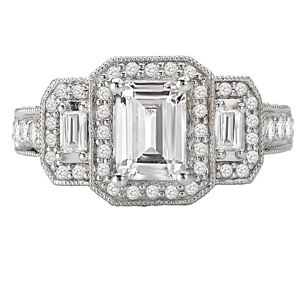 This triple halo diamond ring with milgrain detail is crafted in 14kt white gold and showcases two baguettes on each side of the center stone. (D 7/8 carat total weight) This ring is a SEMI-MOUNT and it comes with NO CENTER STONE as shown but it will accommodate a 7x5mm emerald cut center stone.
