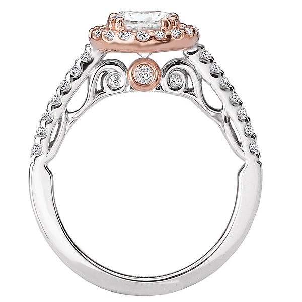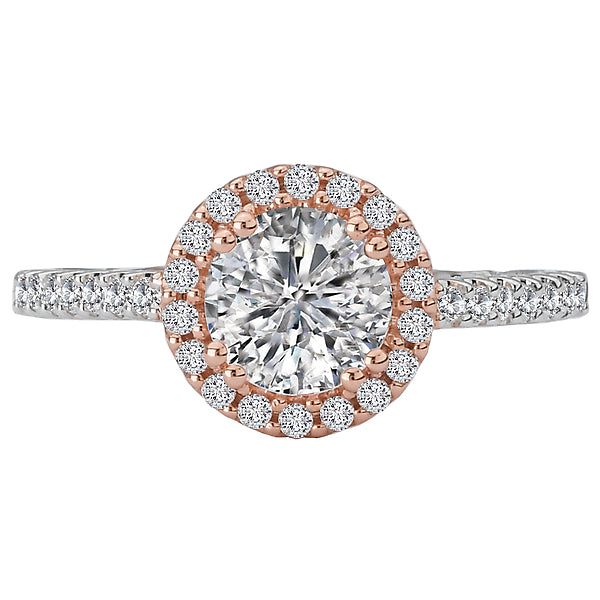 Round Halo Diamond Ring in 14kt White and Rose Gold. (D 1/3 carat total weight) This item is a SEMI-MOUNT and it comes with NO CENTER STONE as shown but it will accommodate a 6.5mm round center stone.