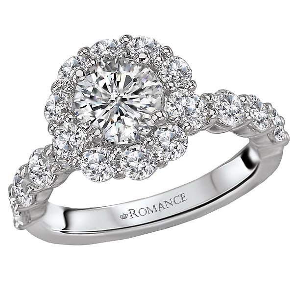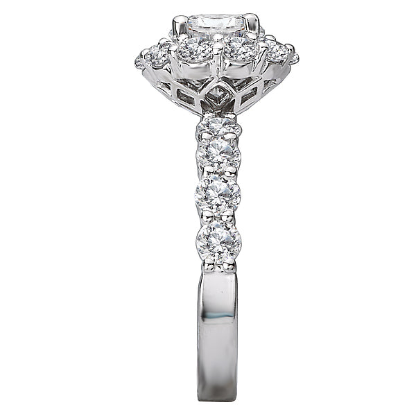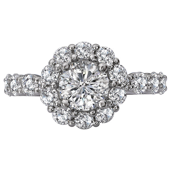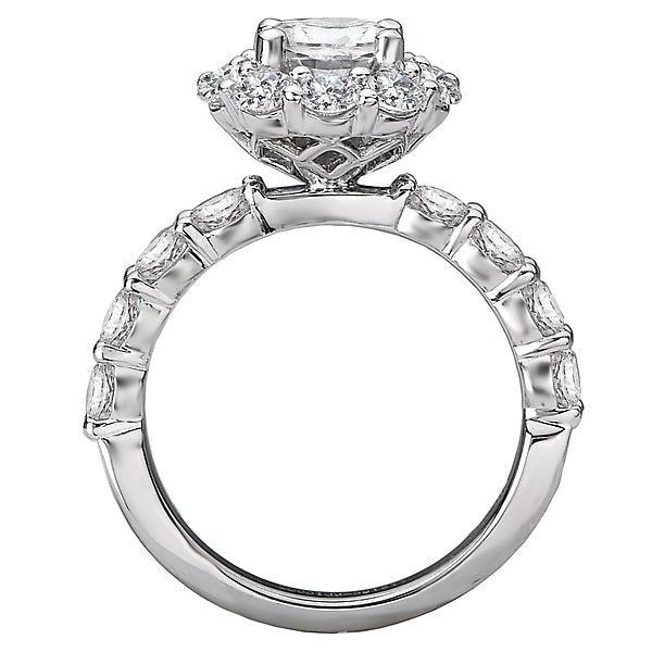 This engagement ring features a halo surrounded with round sparkling diamonds set in high polished 14kt white gold. (D 1 1/2 carat total weight) This ring is a SEMI-MOUNT and it comes with NO CENTER STONE as shown but it will accommodate a 6.5mm round center stone.