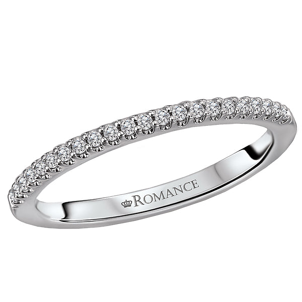 This is a matching wedding band created with round faceted diamonds set in high polished 14kt white gold. (D 1/10 carat total weight)