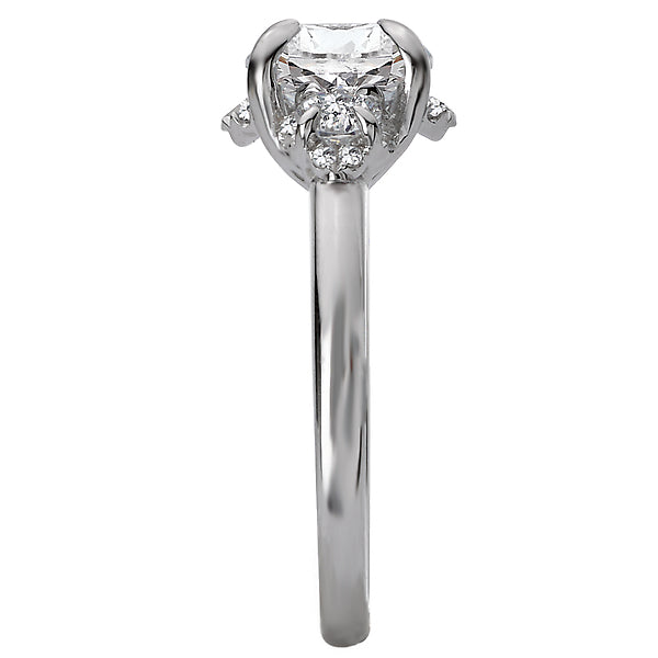 Beautiful trellis bridal ring showcases a unique 3-stone look created with round sparkling diamonds set in high polished 14k white gold. (D 3/8 carat total weight) This SEMI-MOUNT ring comes with NO CENTER STONE but it will accommodate a 7.4mm round center.