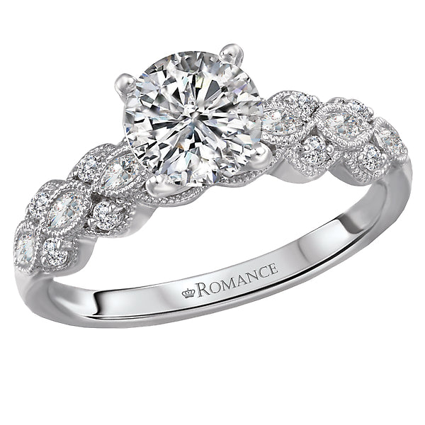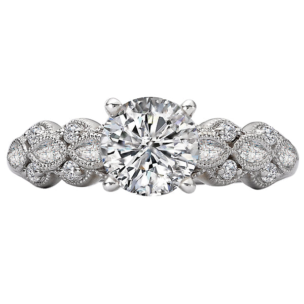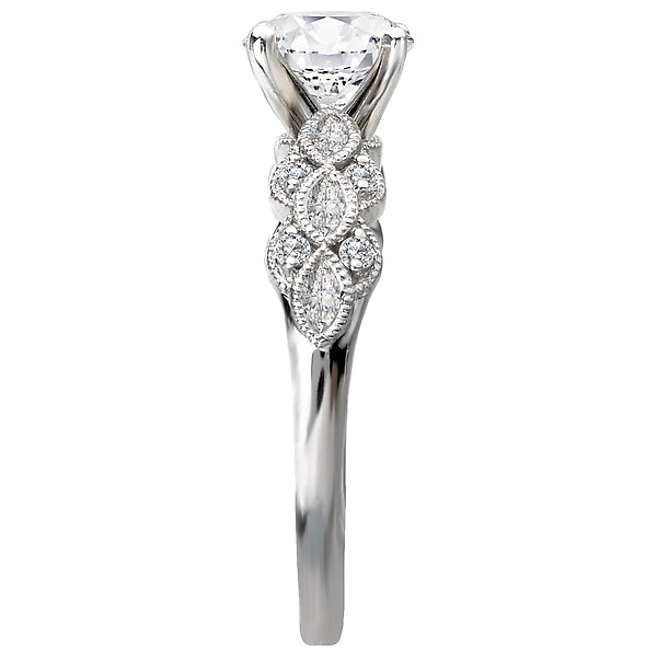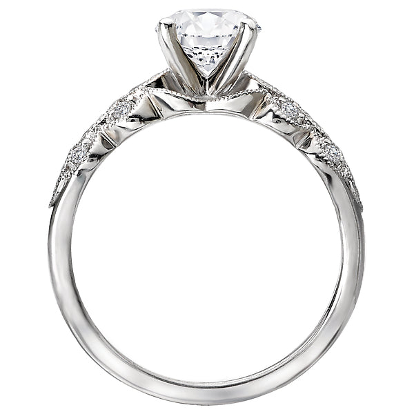 Beautifully hand crafted high polished 14kt white gold engagement ring features brilliant cut diamonds with a center setting that will accommodate a round 6.5mm diamond of your choosing. (D 1/3cw)