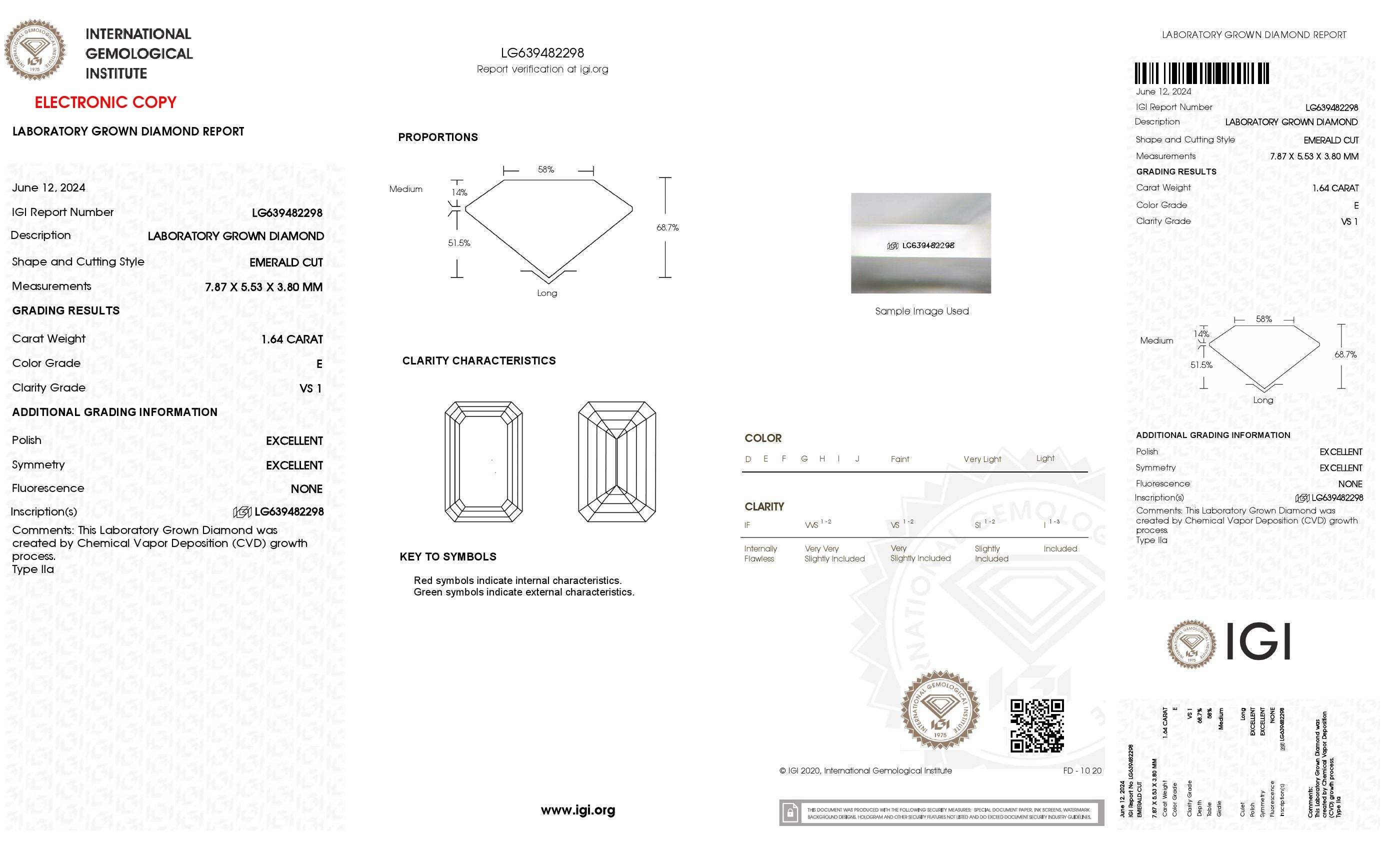 1.64 Ct. Emerald Wholesale IGI Certified Lab Grown Loose Diamond. (Clarity VS1 / E Color)