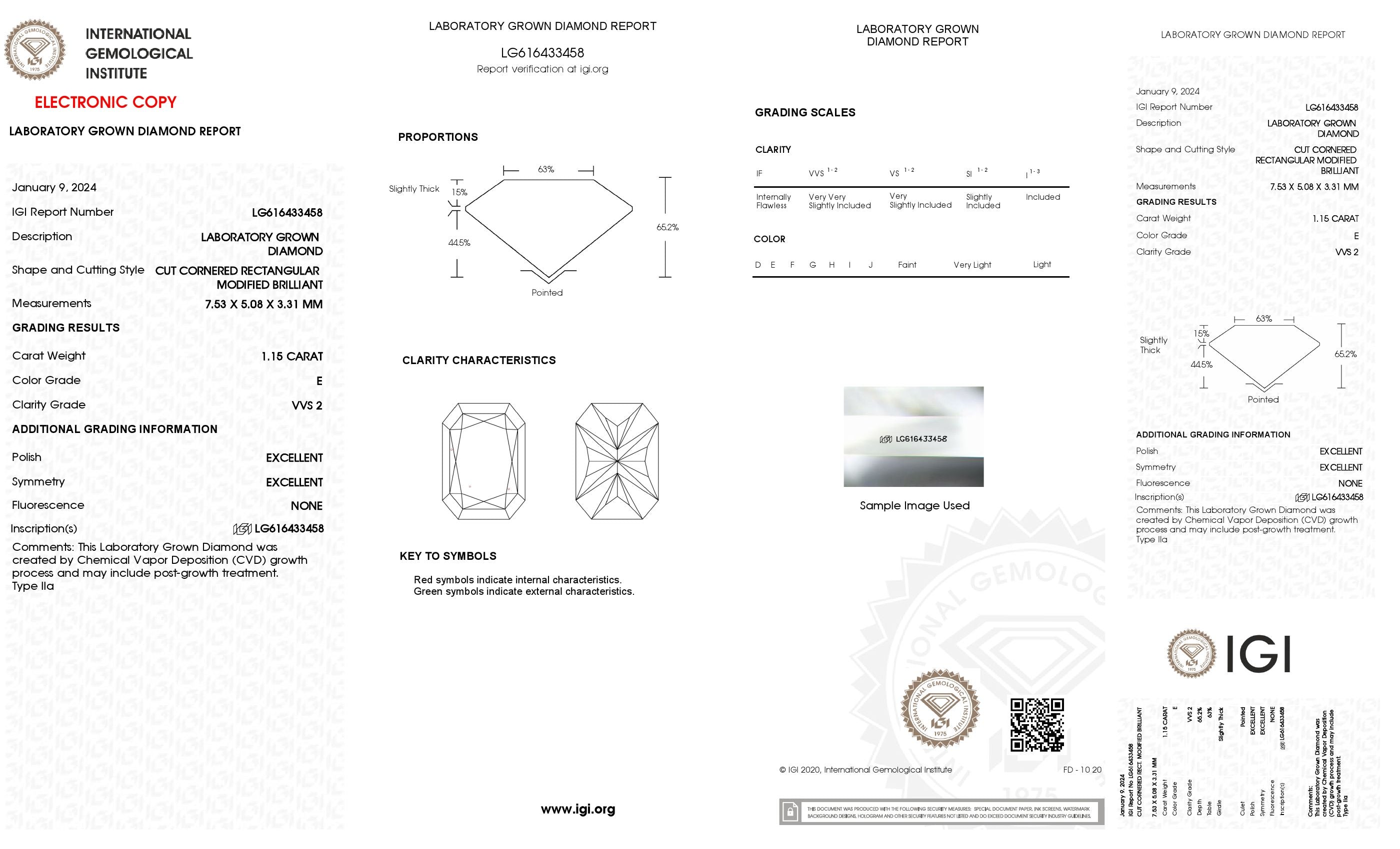 1.15 Ct. Radiant Wholesale IGI Certified Lab Grown Loose Diamond. (Clarity VVS2 / E Color)