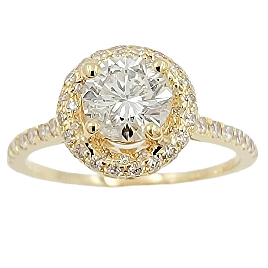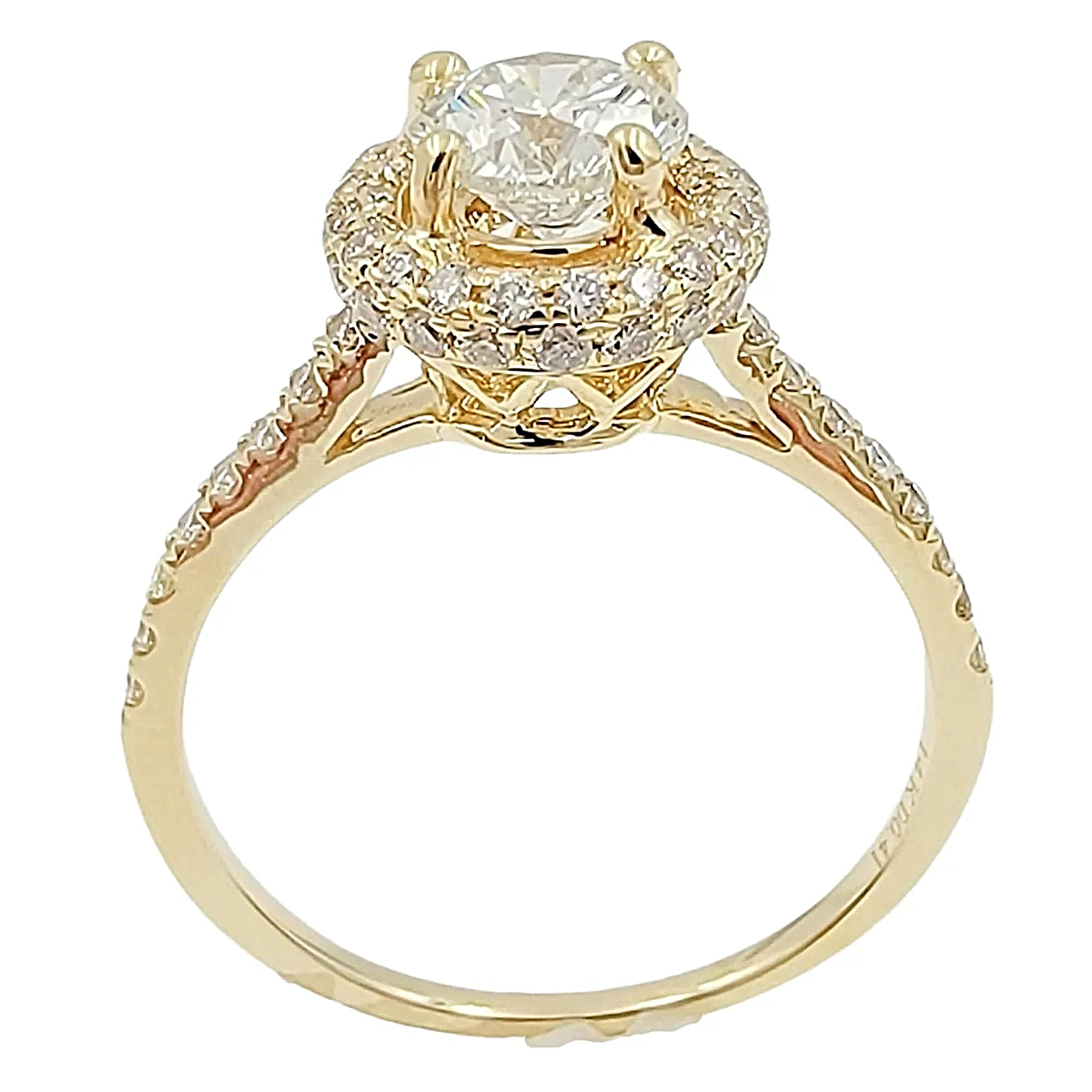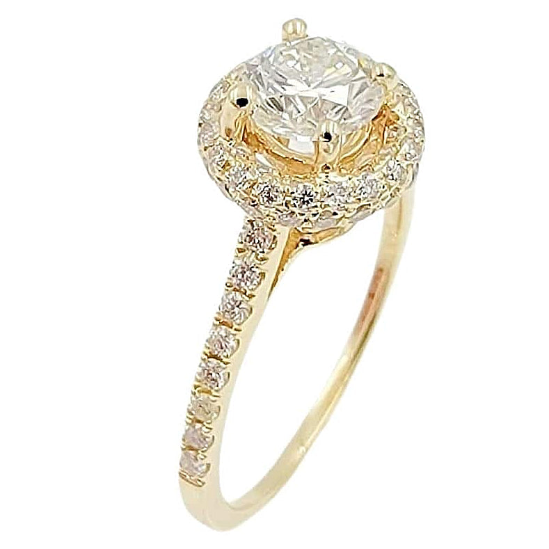 This 14k yellow gold diamond ring is a real showstopper. It's got a tapered shank that gives it a unique and eye-catching look. The star of the show is the large round brilliant cut diamond right in the center, with an H color and I1 clarity inclusions are hidding under the prong making the diamond appear to be vs in clarity. The center stone is a hefty 0.77 carats and is surrounded by a lot of smaller diamonds in a 4-prong halo setting. There are 68 smaller diamonds in the halo and shank, and together they add up to 0.41 carats of bling.