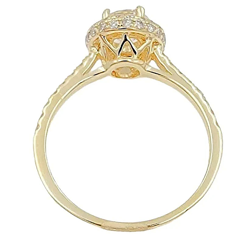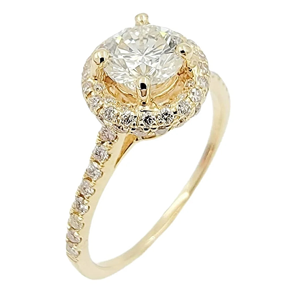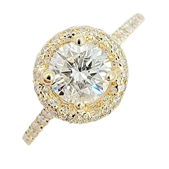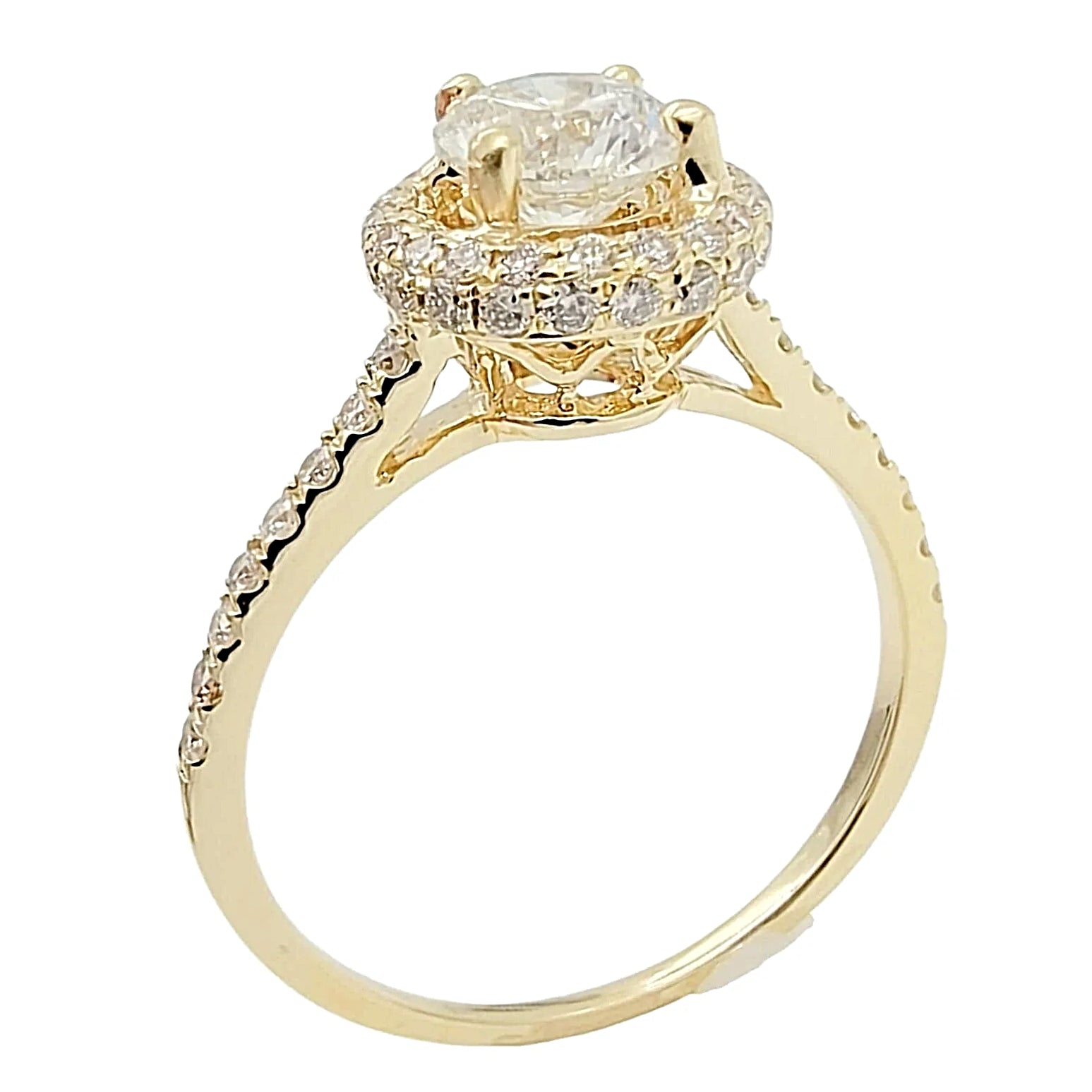 This 14k yellow gold diamond ring is a real showstopper. It's got a tapered shank that gives it a unique and eye-catching look. The star of the show is the large round brilliant cut diamond right in the center, with an H color and I1 clarity inclusions are hidding under the prong making the diamond appear to be vs in clarity. The center stone is a hefty 0.77 carats and is surrounded by a lot of smaller diamonds in a 4-prong halo setting. There are 68 smaller diamonds in the halo and shank, and together they add up to 0.41 carats of bling.