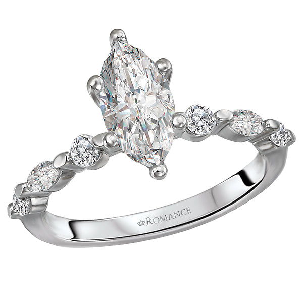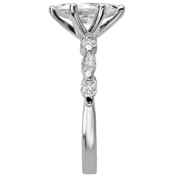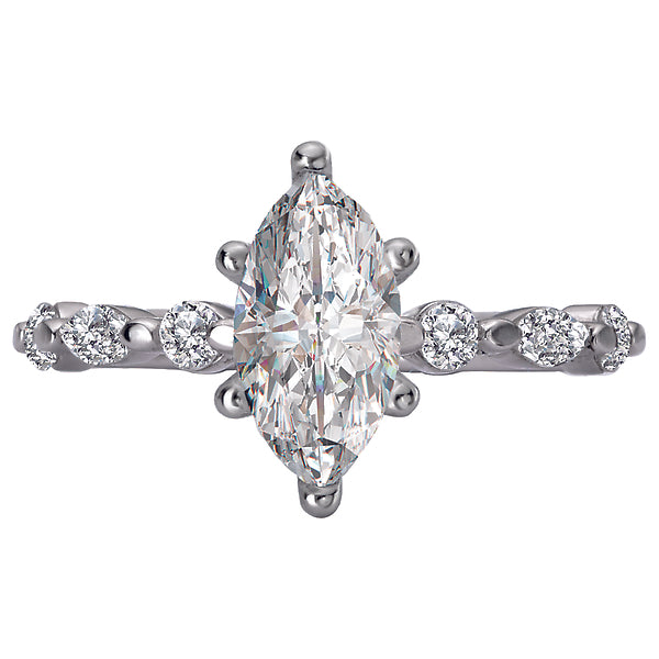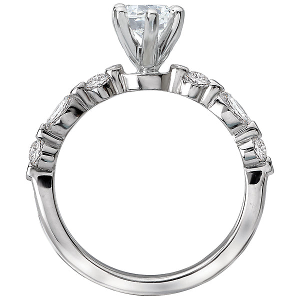 This classic bridal ring sparkles with round and marquise shaped diamonds along the 14kt white gold shaft and a center setting that will accommodate a 10 x 5mm marquise stone. (D 1/3ctw)