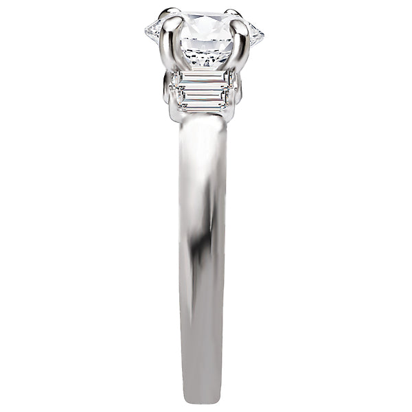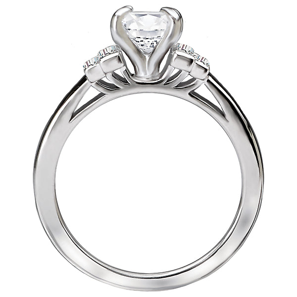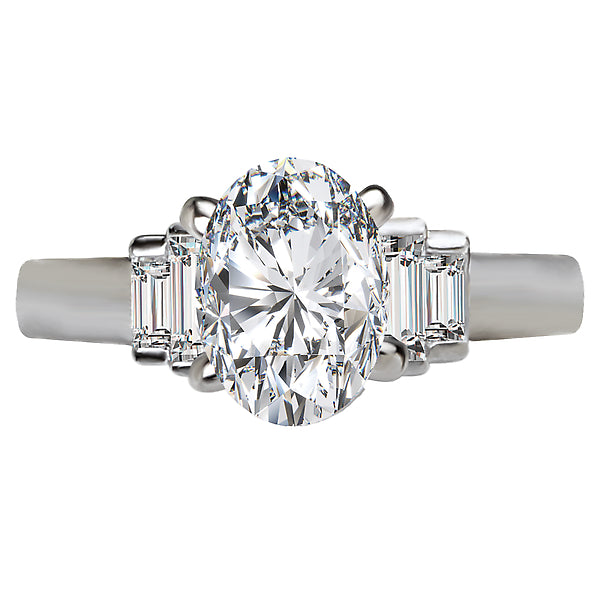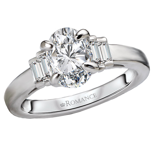 This beautiful 14kt white gold semi-mount engagement ring features sparkling baguette diamonds beside a setting that will accommodate a 7x5mm oval diamond of your choosing. (D 1/3 carat weight)