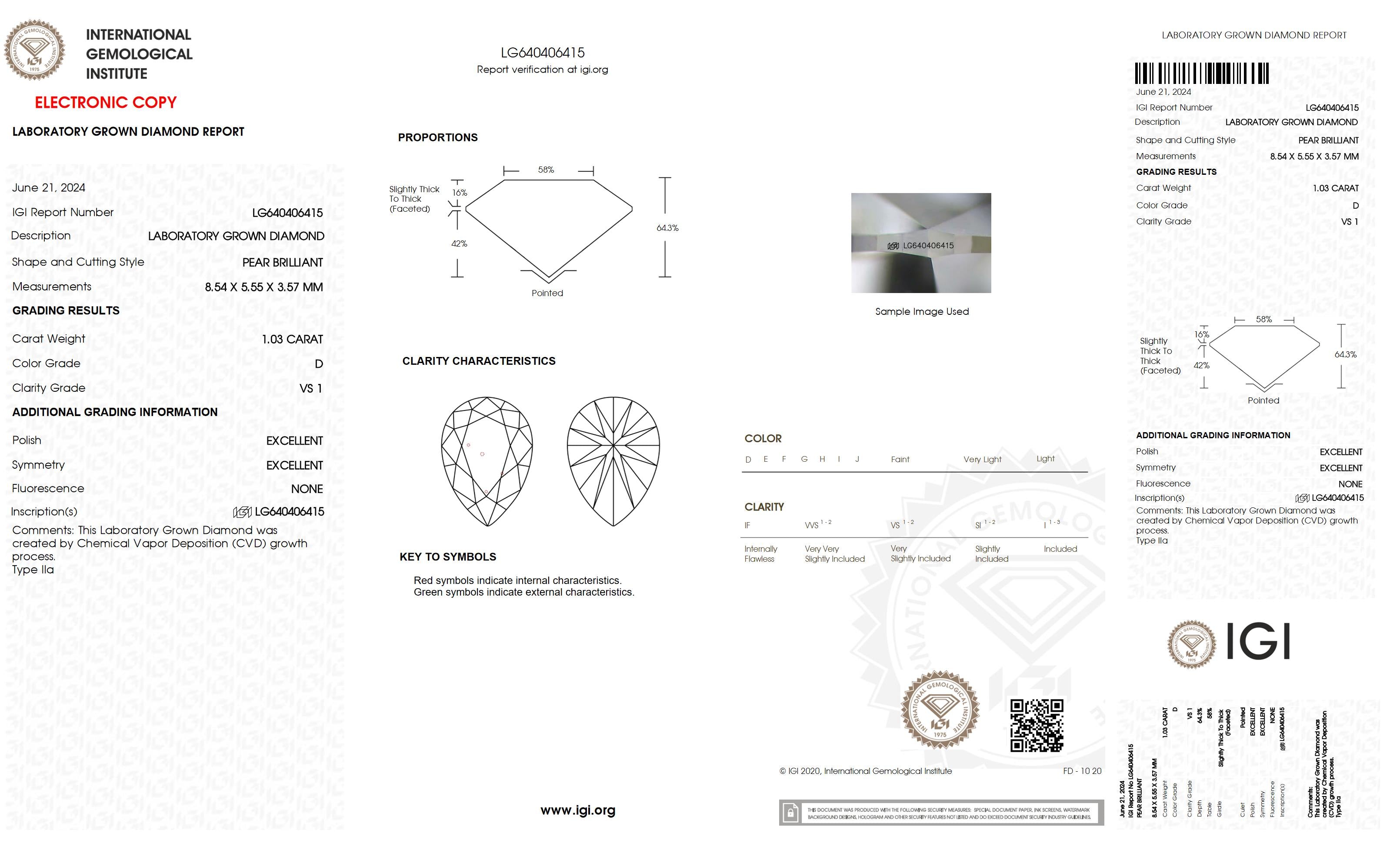 1.03 Ct. Pear Wholesale IGI Certified Lab Grown Loose Diamond. (Clarity VS1 / D Color)