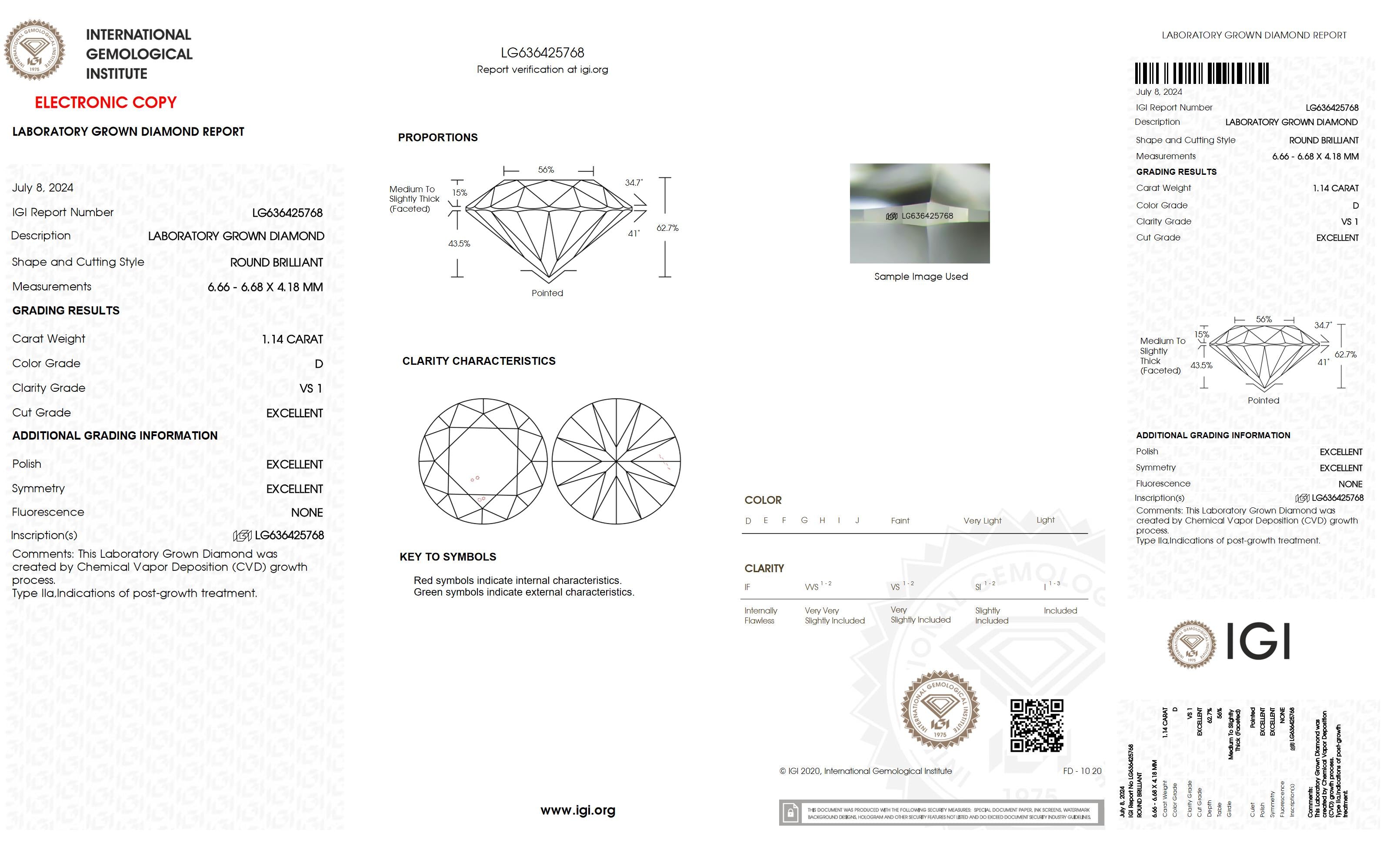 1.14 Ct. Round Wholesale IGI Certified Lab Grown Loose Diamond. (Clarity VS1 / D Color)