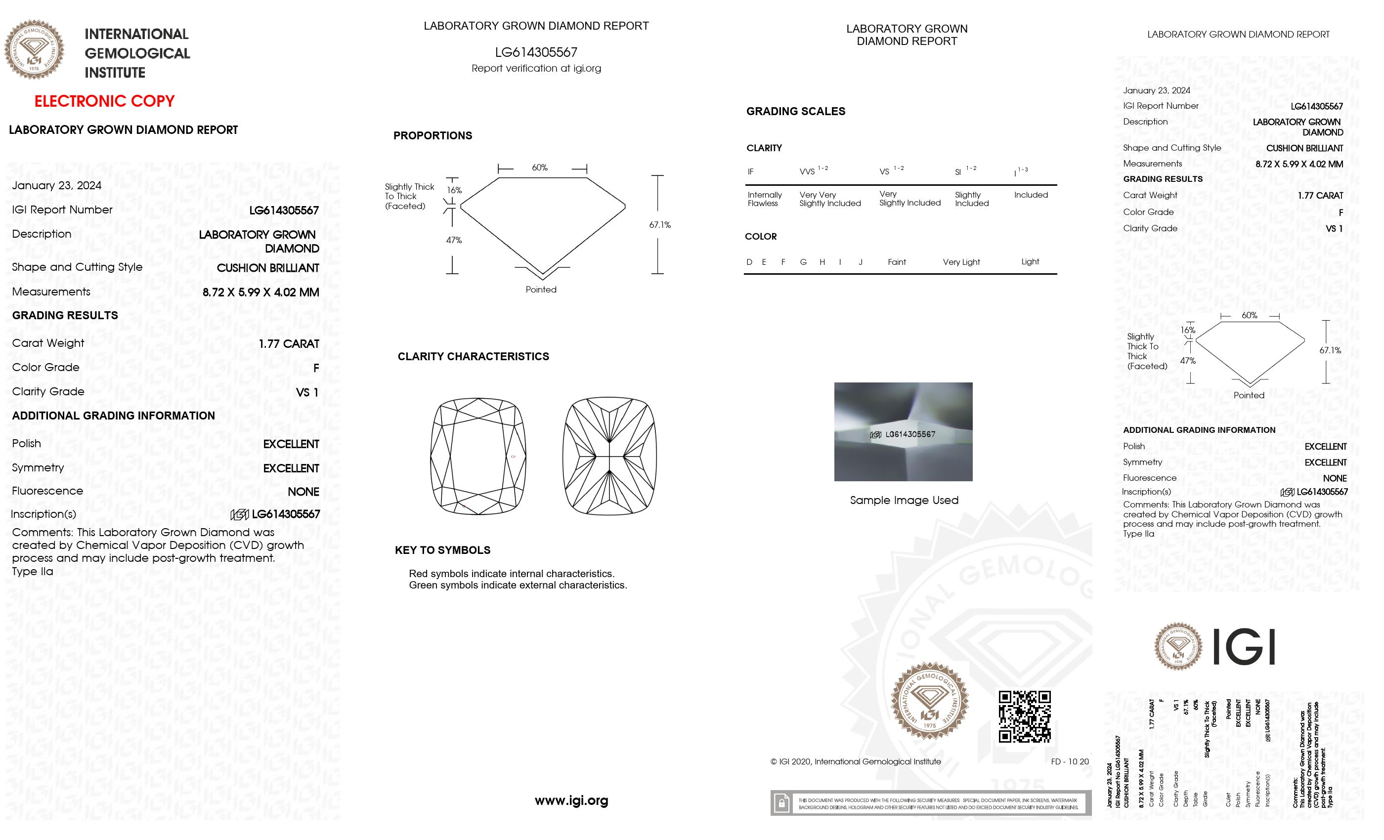 1.77 Ct. Cushion long Wholesale IGI Certified Lab Grown Loose Diamond. (Clarity VS1 / F Color)