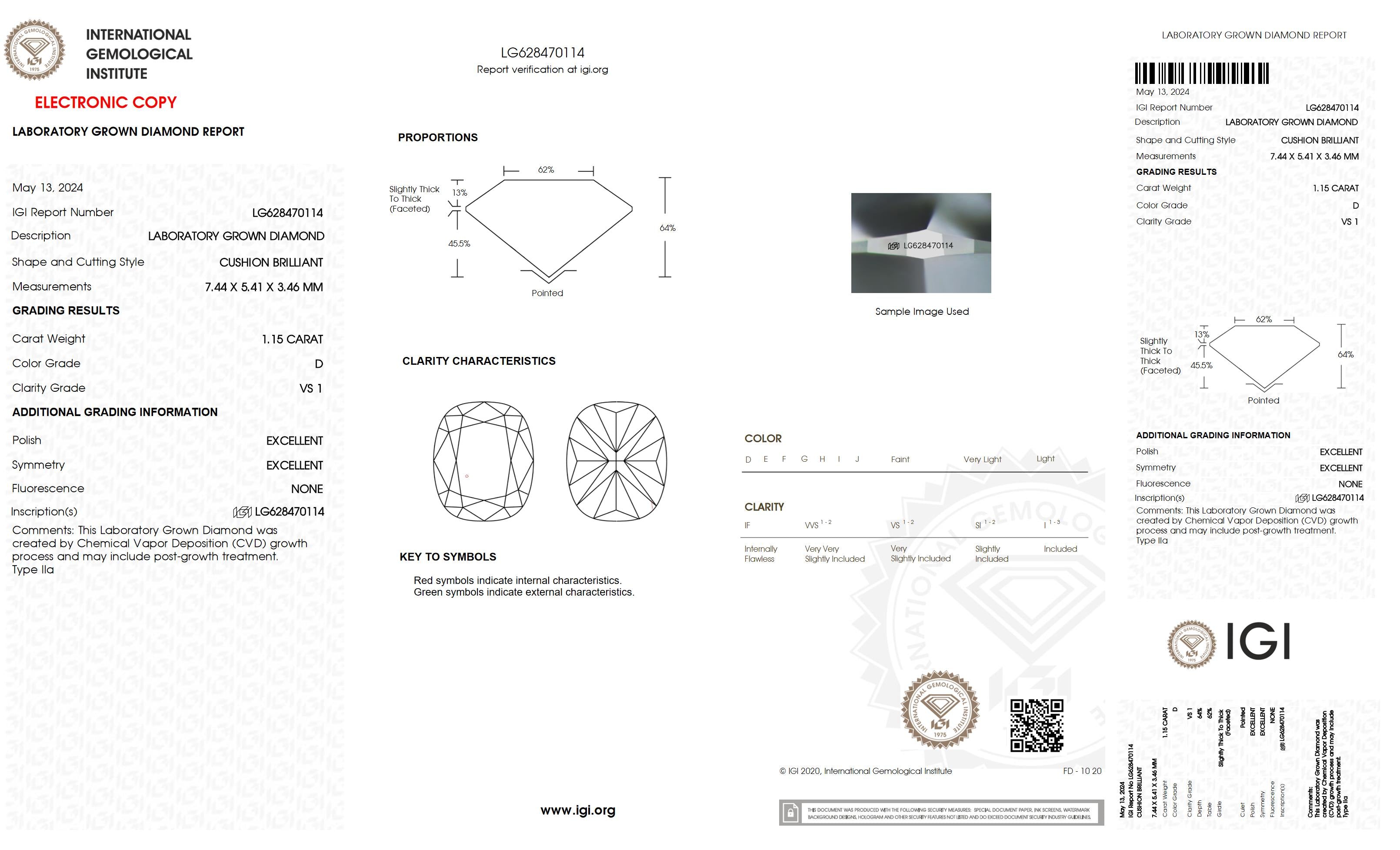 1.15 Ct. Cushion long Wholesale IGI Certified Lab Grown Loose Diamond. (Clarity VS1 / D Color)
