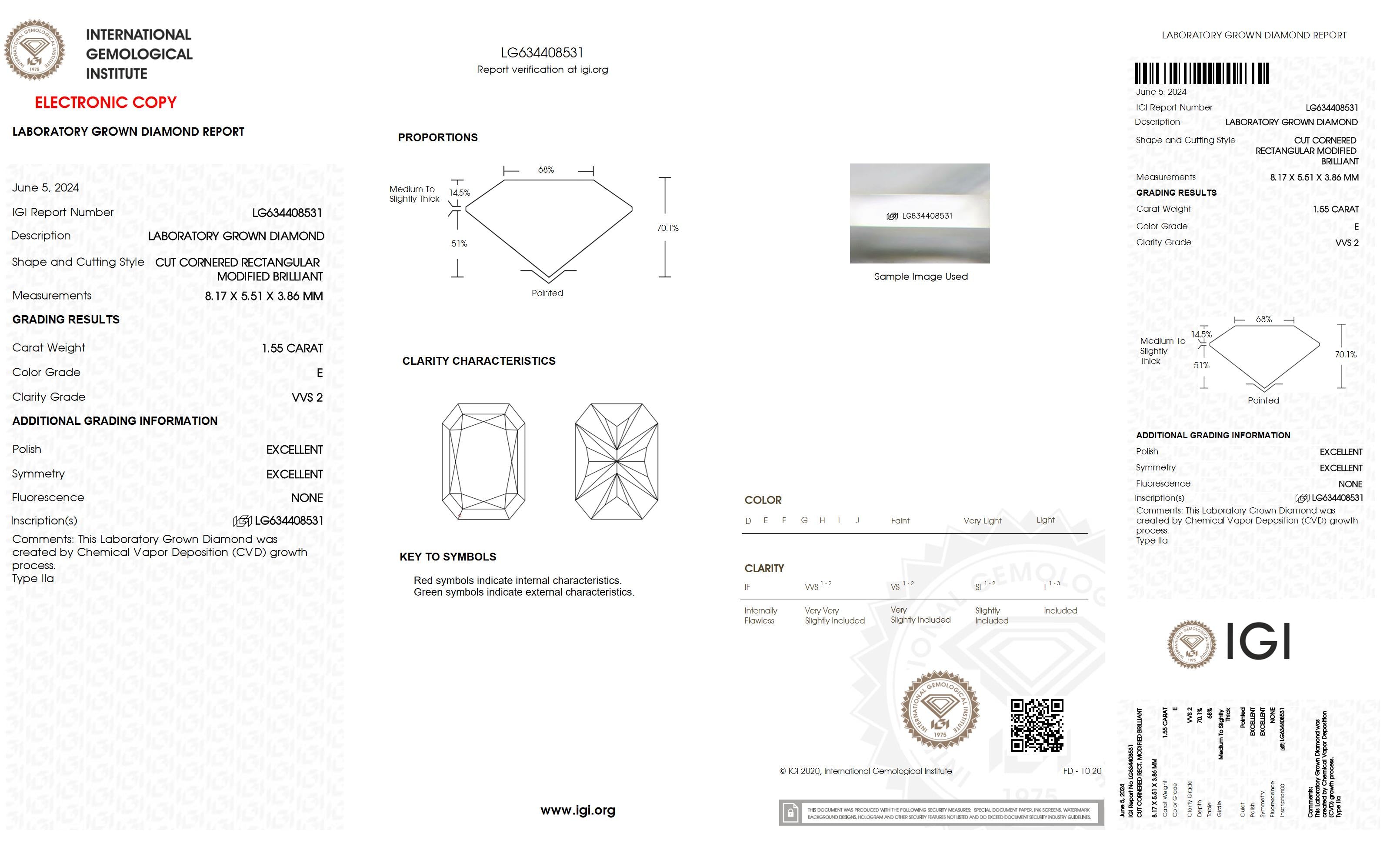 1.55 Ct. Radiant Wholesale IGI Certified Lab Grown Loose Diamond. (Clarity VVS2 / E Color)
