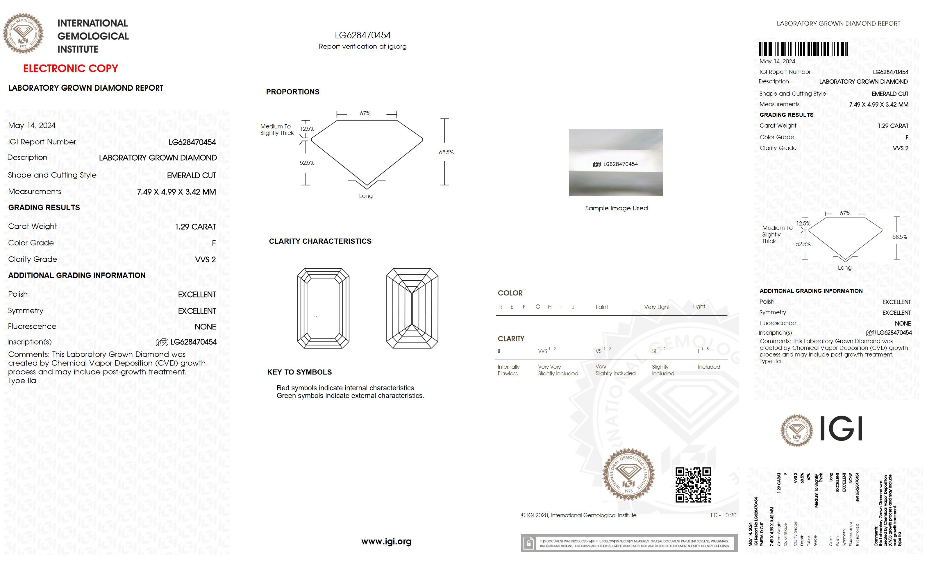 1.29 Ct. Emerald Wholesale IGI Certified Lab Grown Loose Diamond. (Clarity VVS2 / F Color)