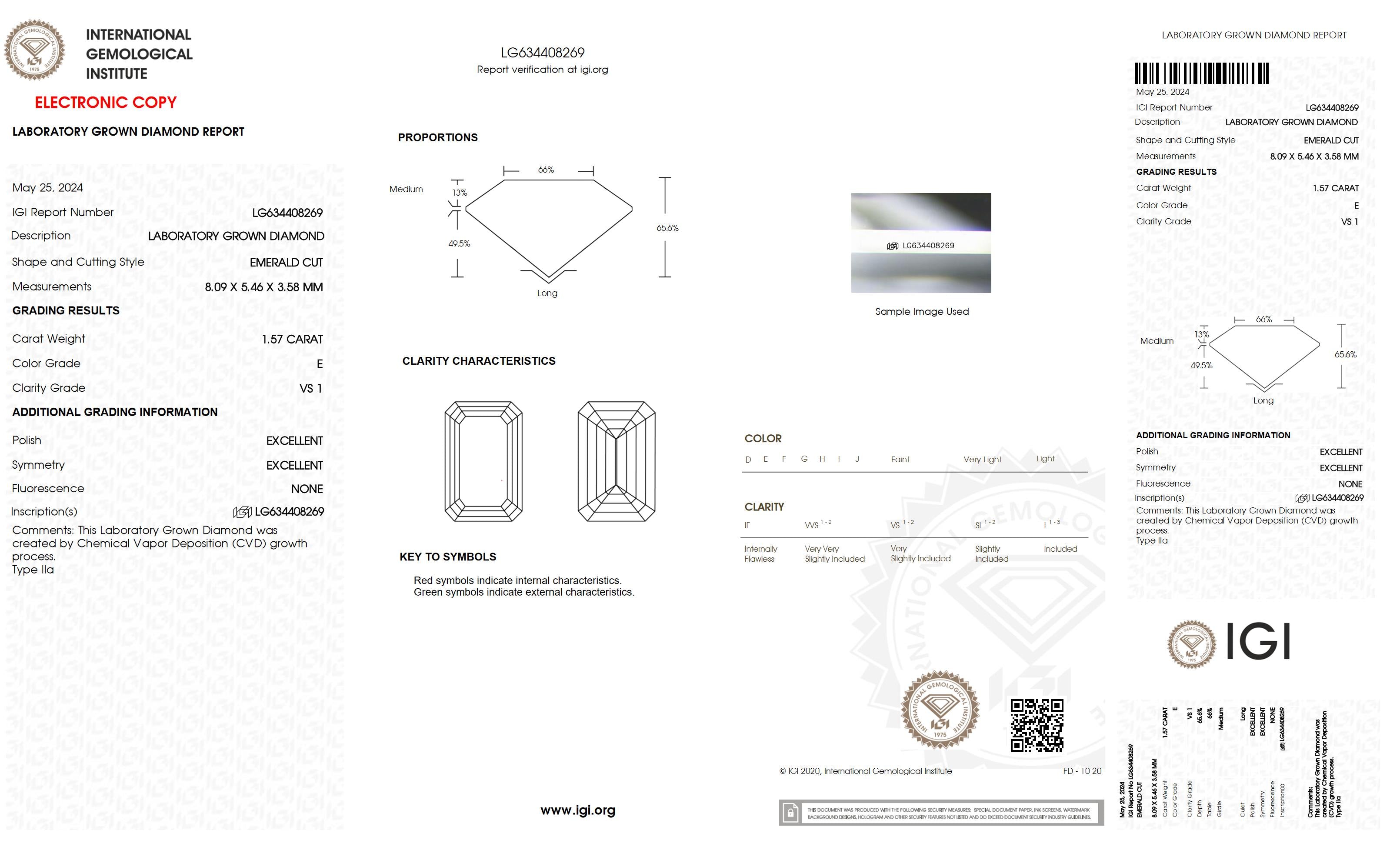 1.57 Ct. Emerald Wholesale IGI Certified Lab Grown Loose Diamond. (Clarity VS1 / E Color)