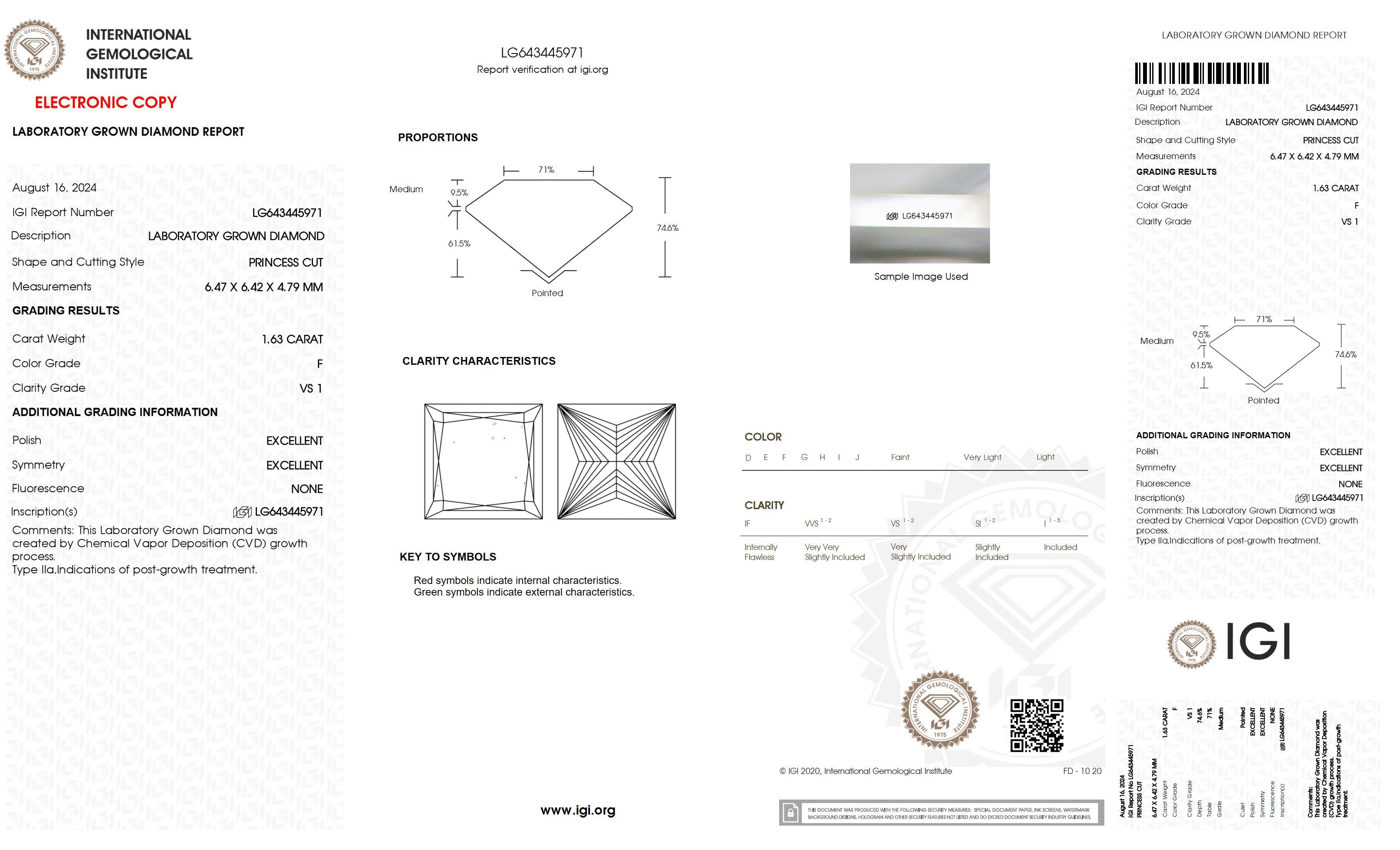 1.63 Ct. Princess Wholesale IGI Certified Lab Grown Loose Diamond. (Clarity VS1 / F Color)
