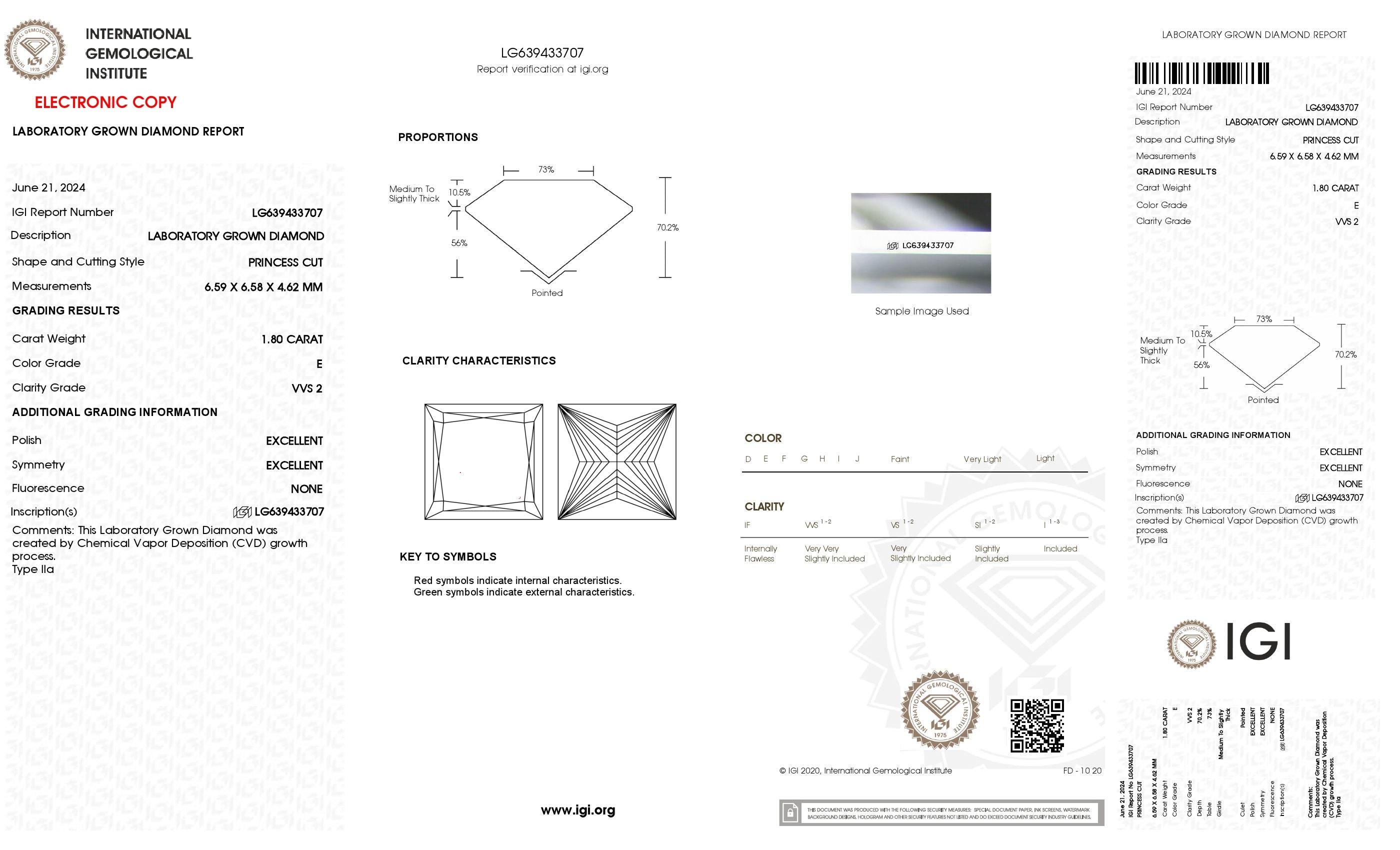 1.8 Ct. Princess Wholesale IGI Certified Lab Grown Loose Diamond. (Clarity VVS2 / E Color) Experience the luxury and style of our exquisite lab-grown diamond collection. Adorned with a magnificent 1.00 to 15.00 carat lab-grown center stone, each piece is certified by IGI for your peace of mind. Our lab-grown diamonds are renowned for their superior sparkle, making them an ideal choice for any engagement ring. We also handpick our diamonds and choose the finest laboratory grown diamonds for our customers, ensuring exceptional quality. Our lab grown diamonds are carefully selected for their superior cut and clarity. Every lab-grown diamond we provide is accompanied by an IGI certificate for premium quality and authenticity.