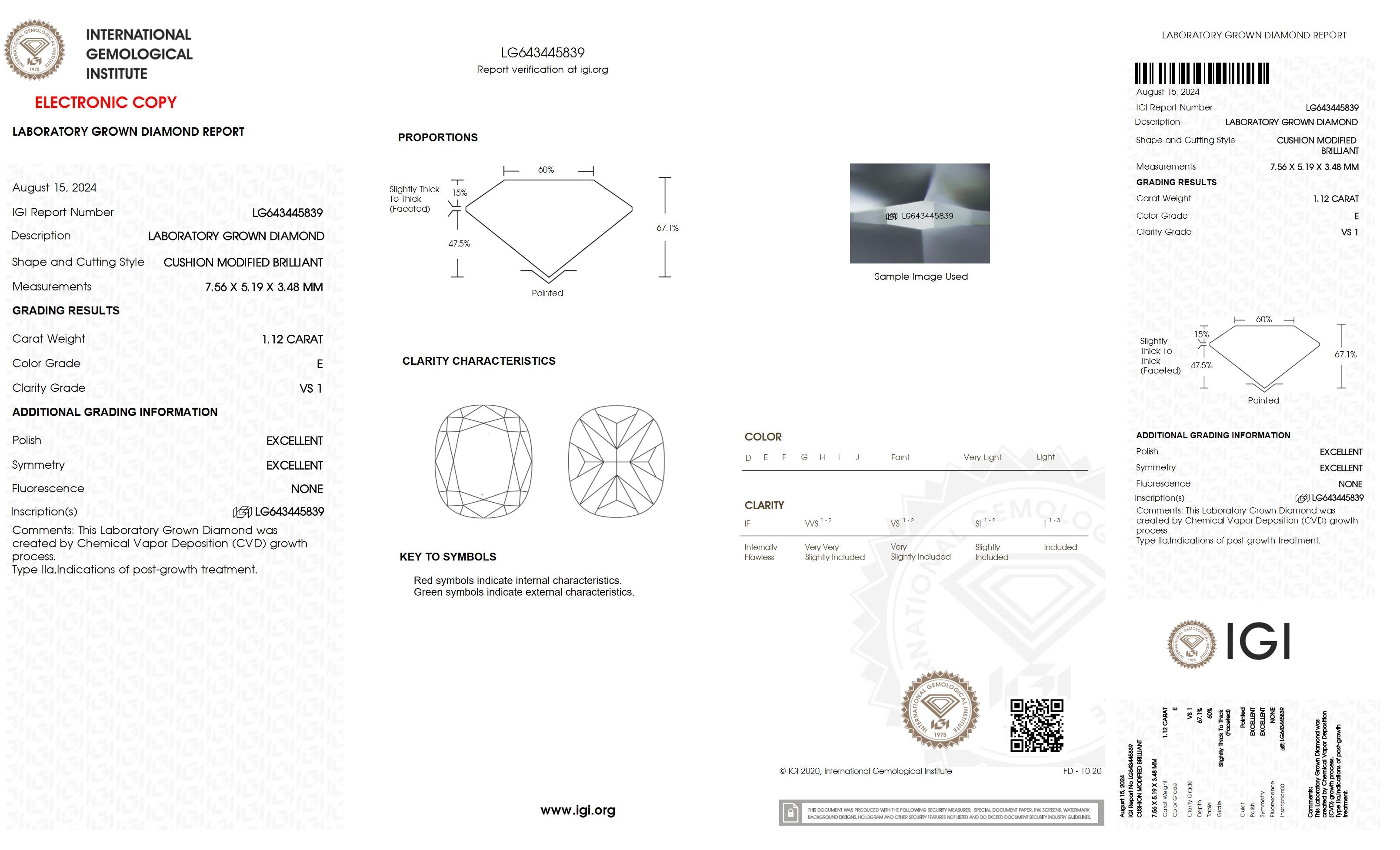 1.12 Ct. Cushion long Wholesale IGI Certified Lab Grown Loose Diamond. (Clarity VS1 / E Color)