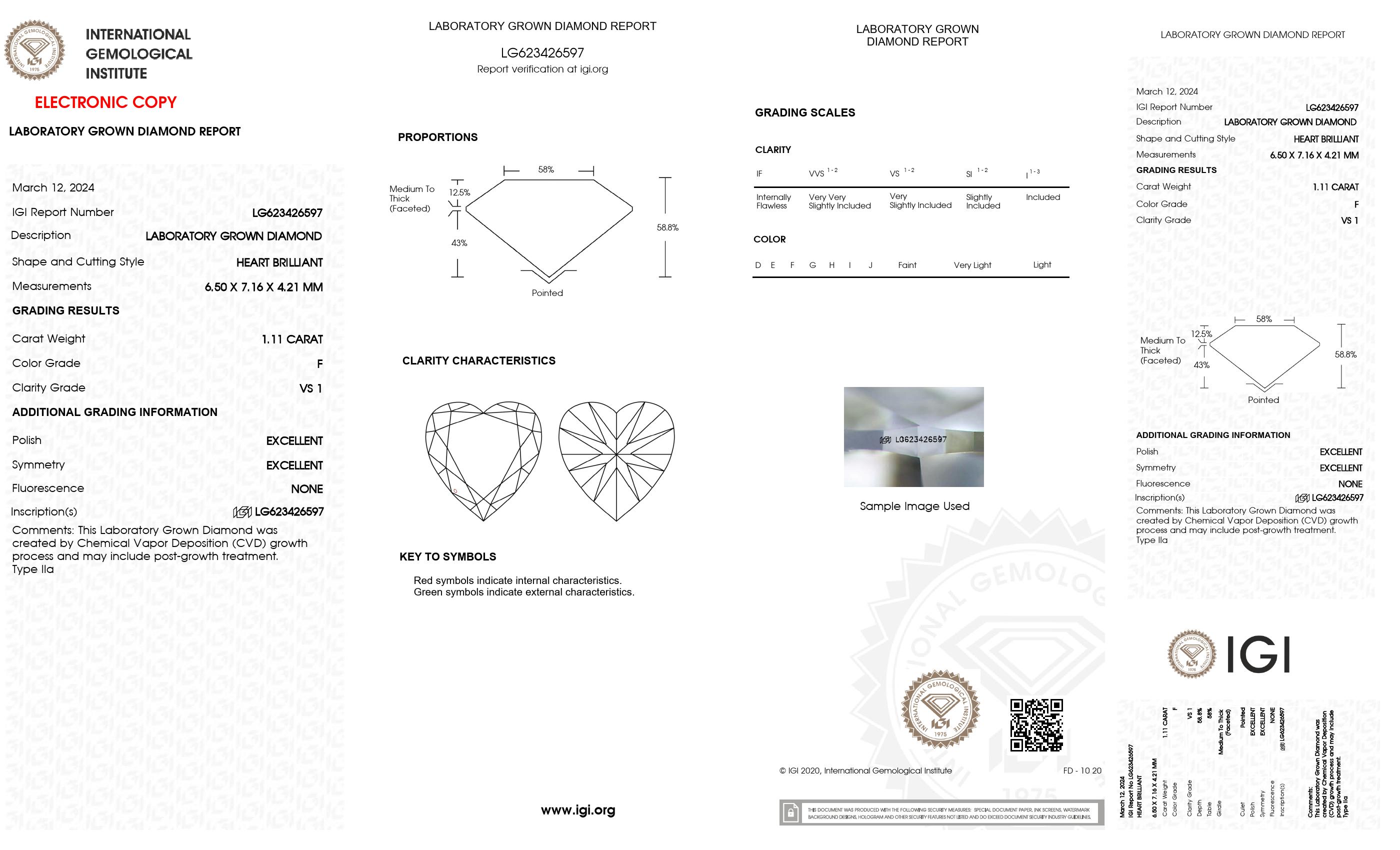 1.11 Ct. Heart Wholesale IGI Certified Lab Grown Loose Diamond. (Clarity VS1 / F Color)