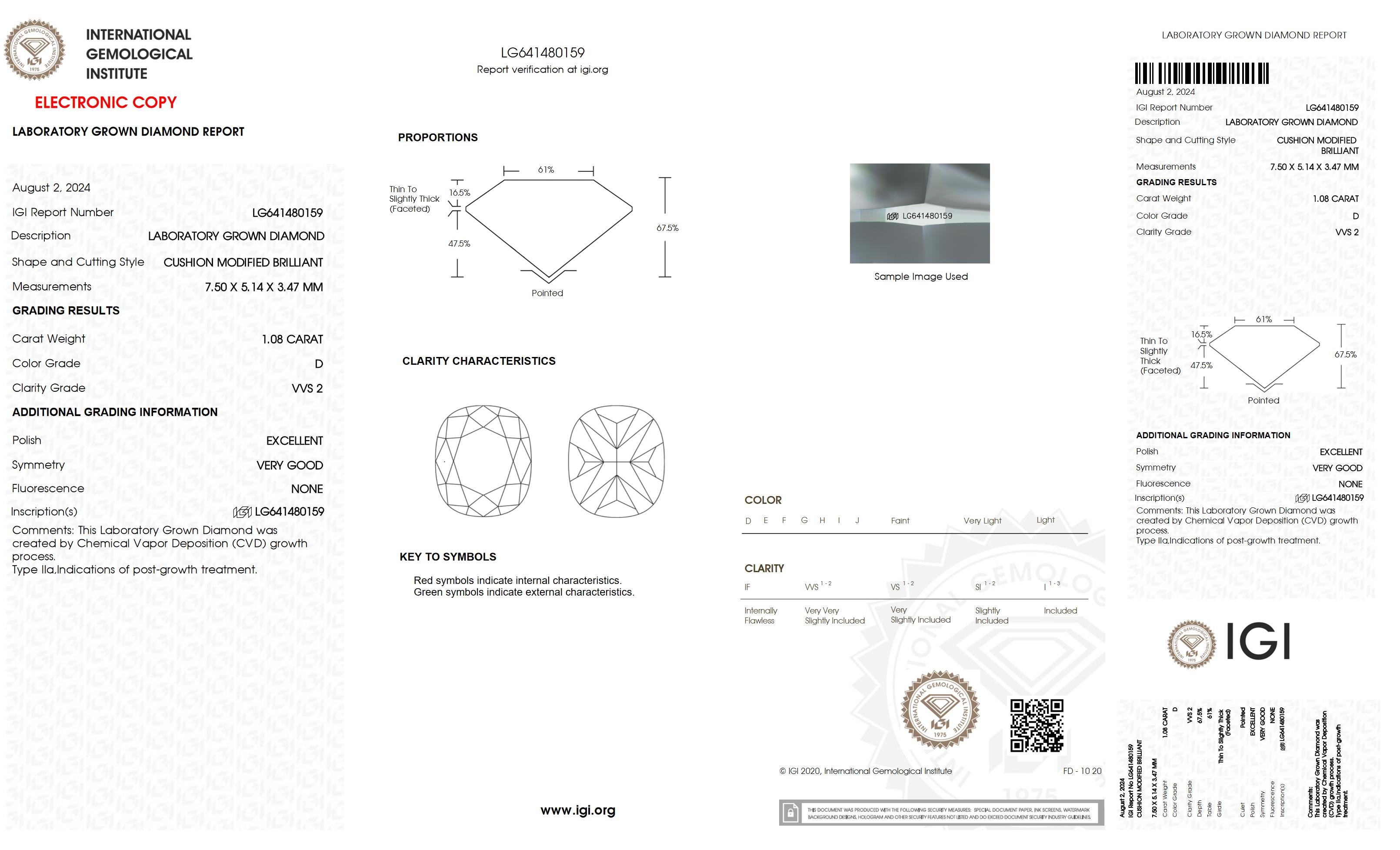 1.08 Ct. Cushion long Wholesale IGI Certified Lab Grown Loose Diamond. (Clarity VVS2 / D Color)