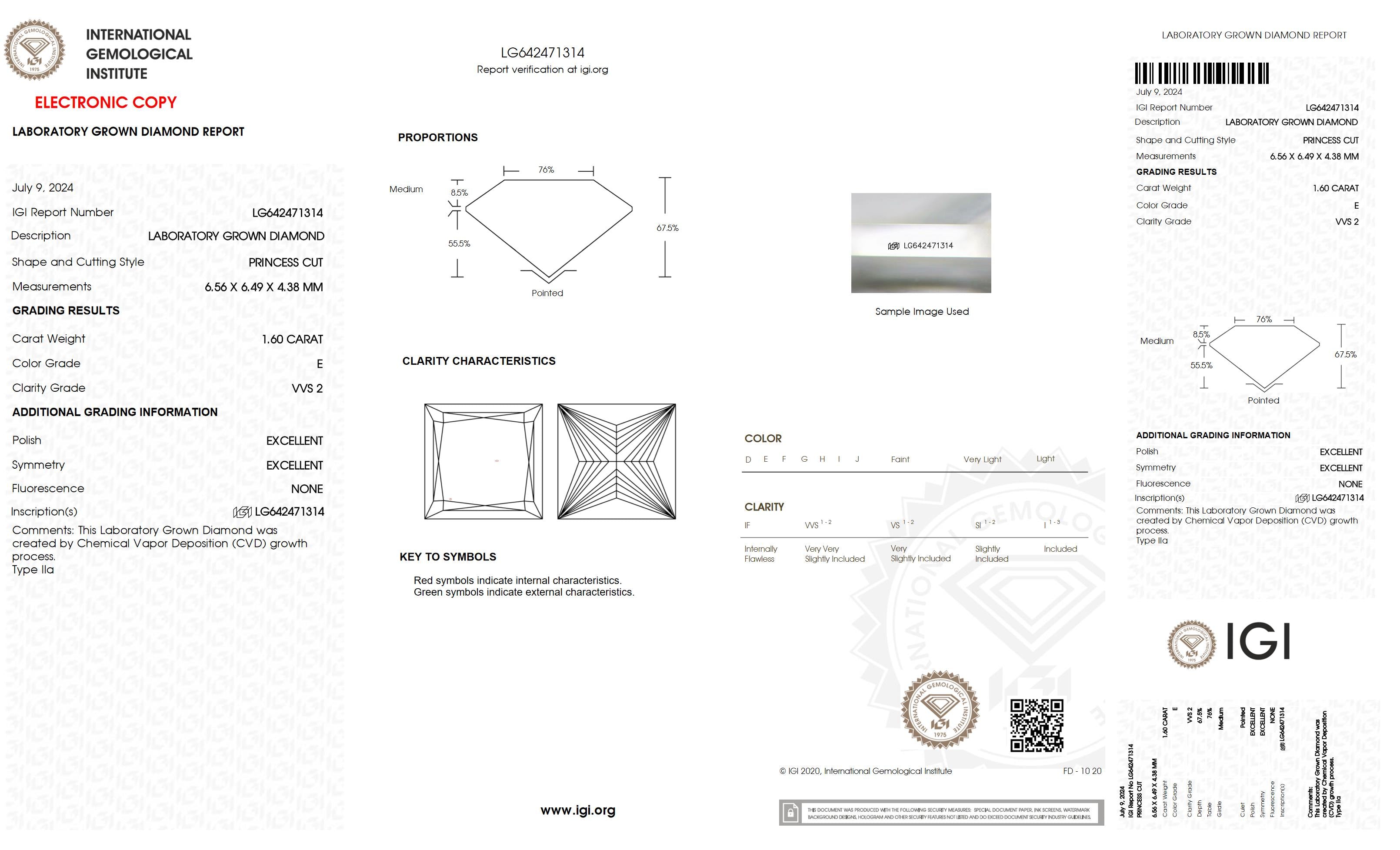 1.6 Ct. Princess Wholesale IGI Certified Lab Grown Loose Diamond. (Clarity VVS2 / E Color)