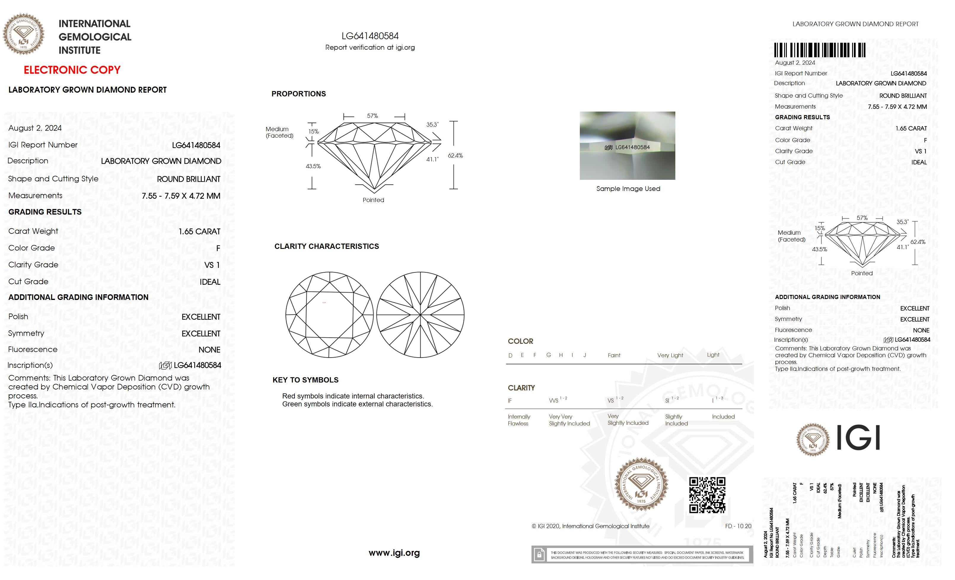 1.65 Ct. Round Wholesale IGI Certified Lab Grown Loose Diamond. (Clarity VS1 / F Color)