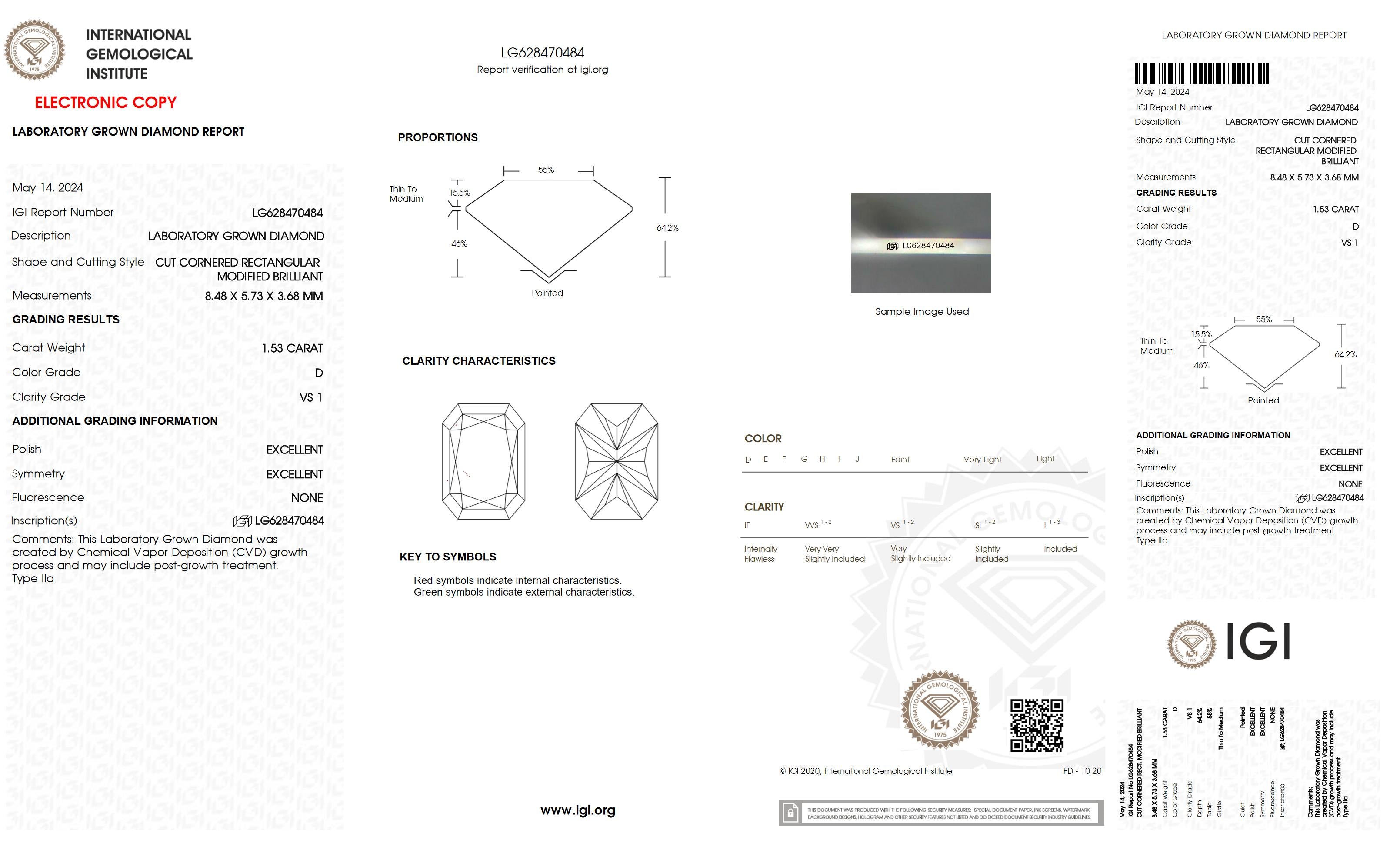 1.53 Ct. Radiant Wholesale IGI Certified Lab Grown Loose Diamond. (Clarity VS1 / D Color)