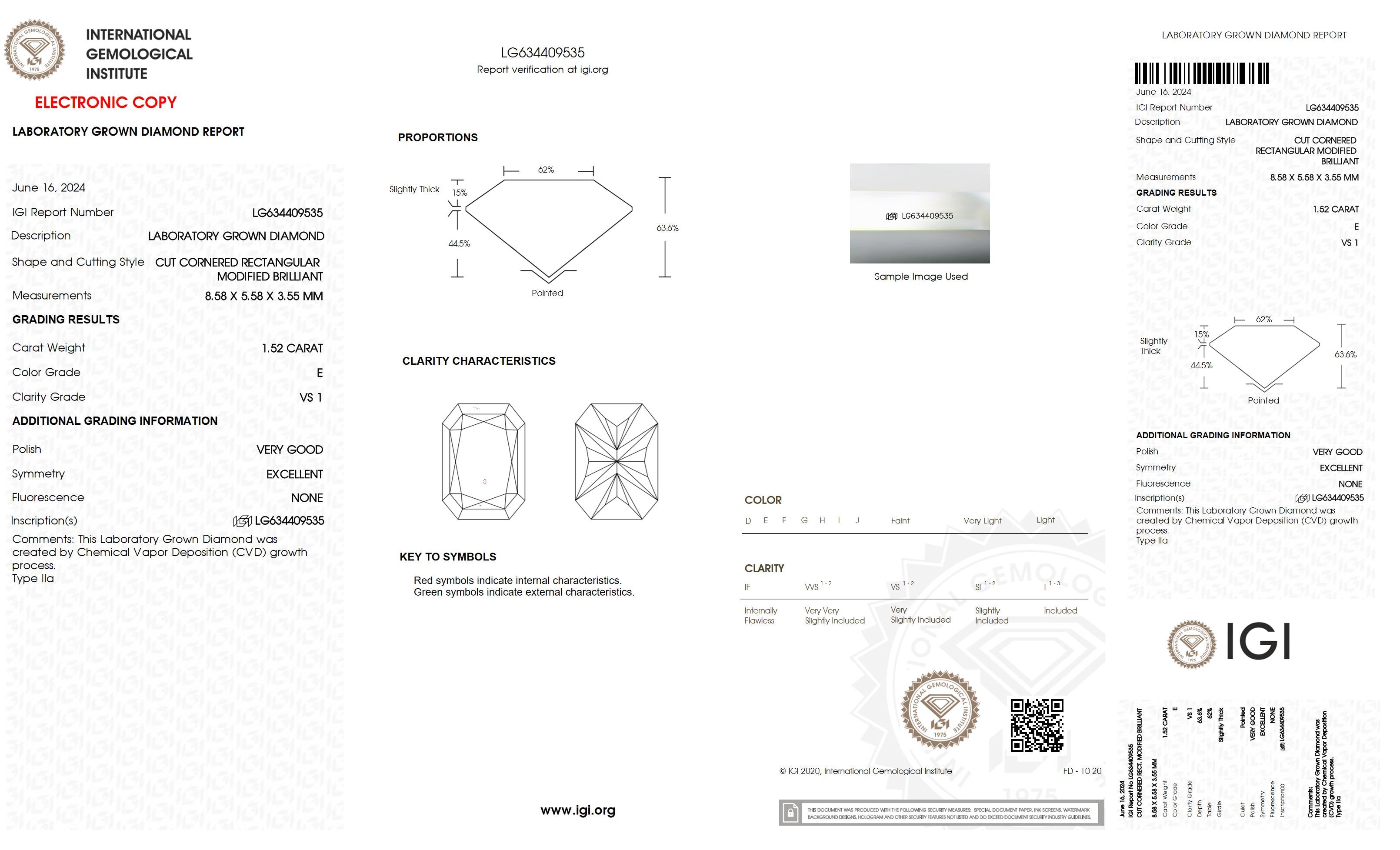 1.52 Ct. Radiant Wholesale IGI Certified Lab Grown Loose Diamond. (Clarity VS1 / E Color)