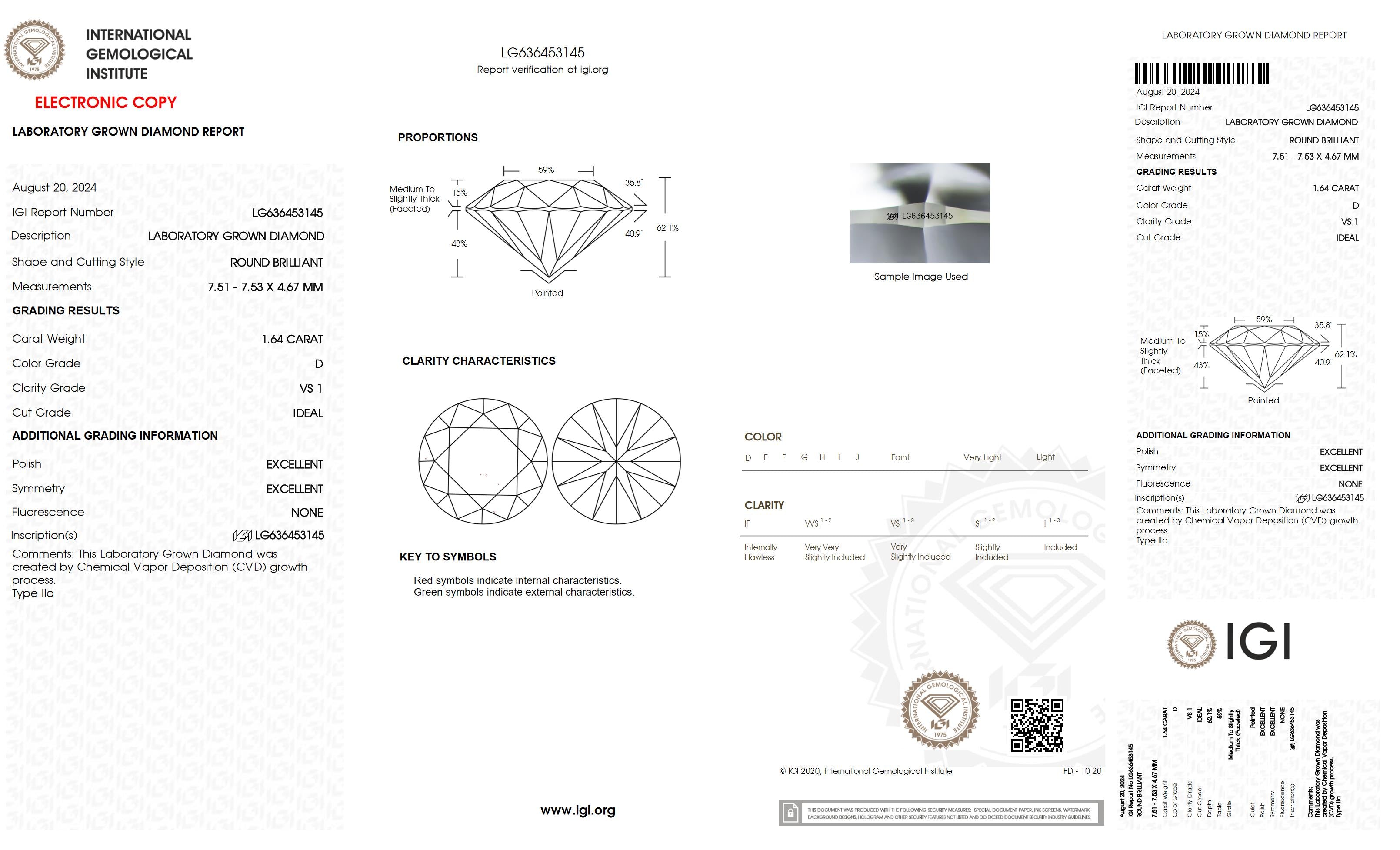 1.64 Ct. Round Wholesale IGI Certified Lab Grown Loose Diamond. (Clarity VS1 / D Color)