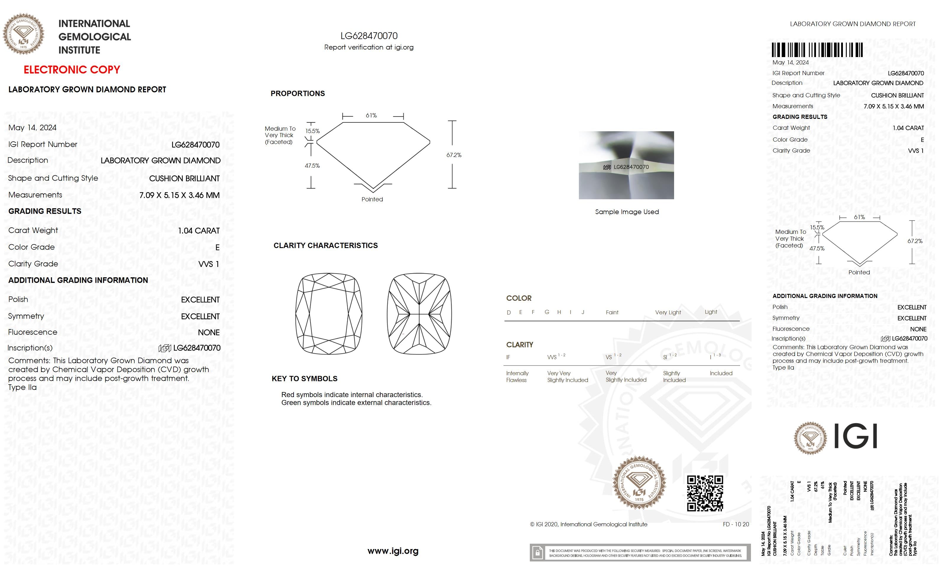 1.04 Ct. Cushion long Wholesale IGI Certified Lab Grown Loose Diamond. (Clarity VVS1 / E Color)