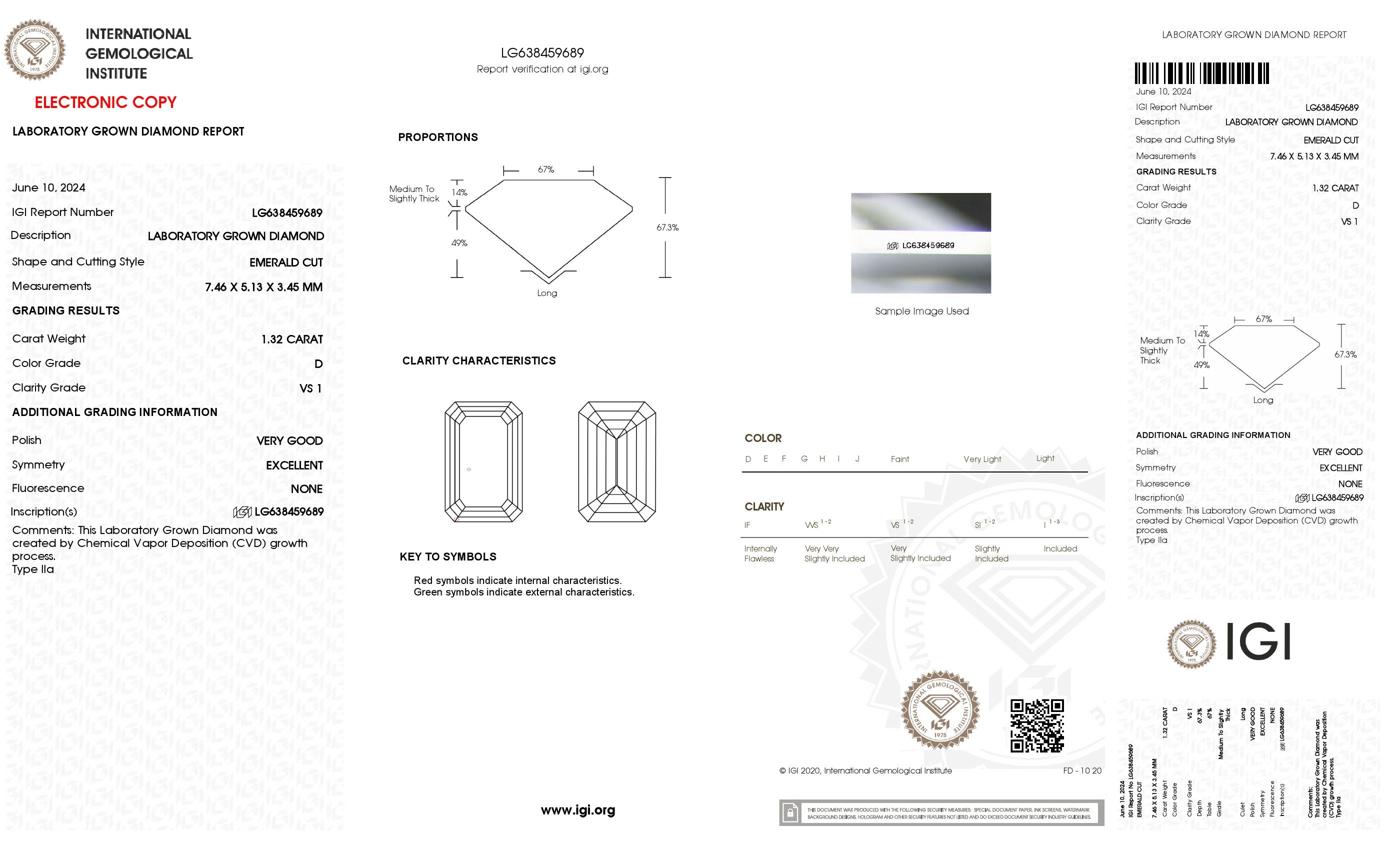 1.32 Ct. Emerald Wholesale IGI Certified Lab Grown Loose Diamond. (Clarity VS1 / D Color)