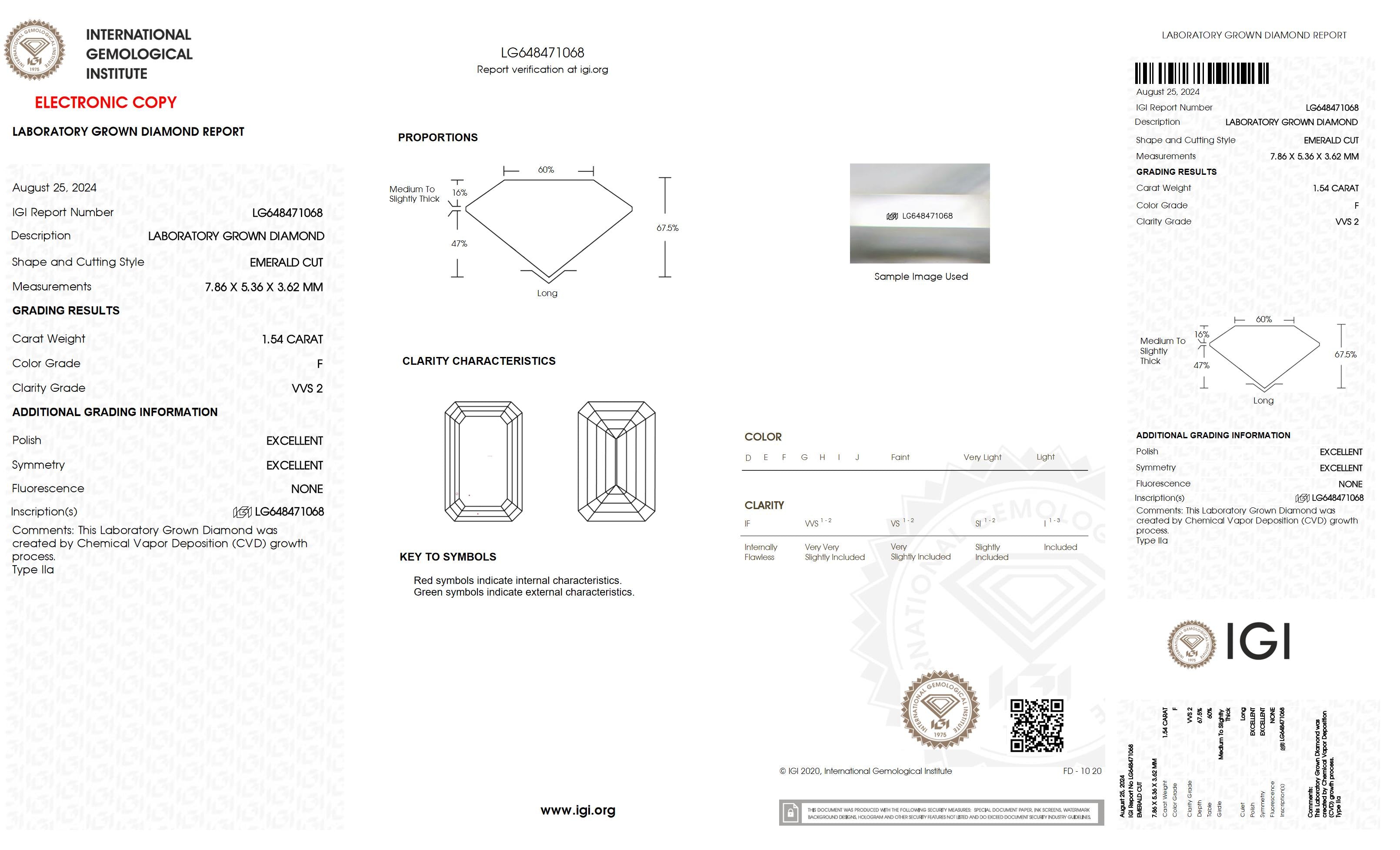 1.54 Ct. Emerald Wholesale IGI Certified Lab Grown Loose Diamond. (Clarity VVS2 / F Color)