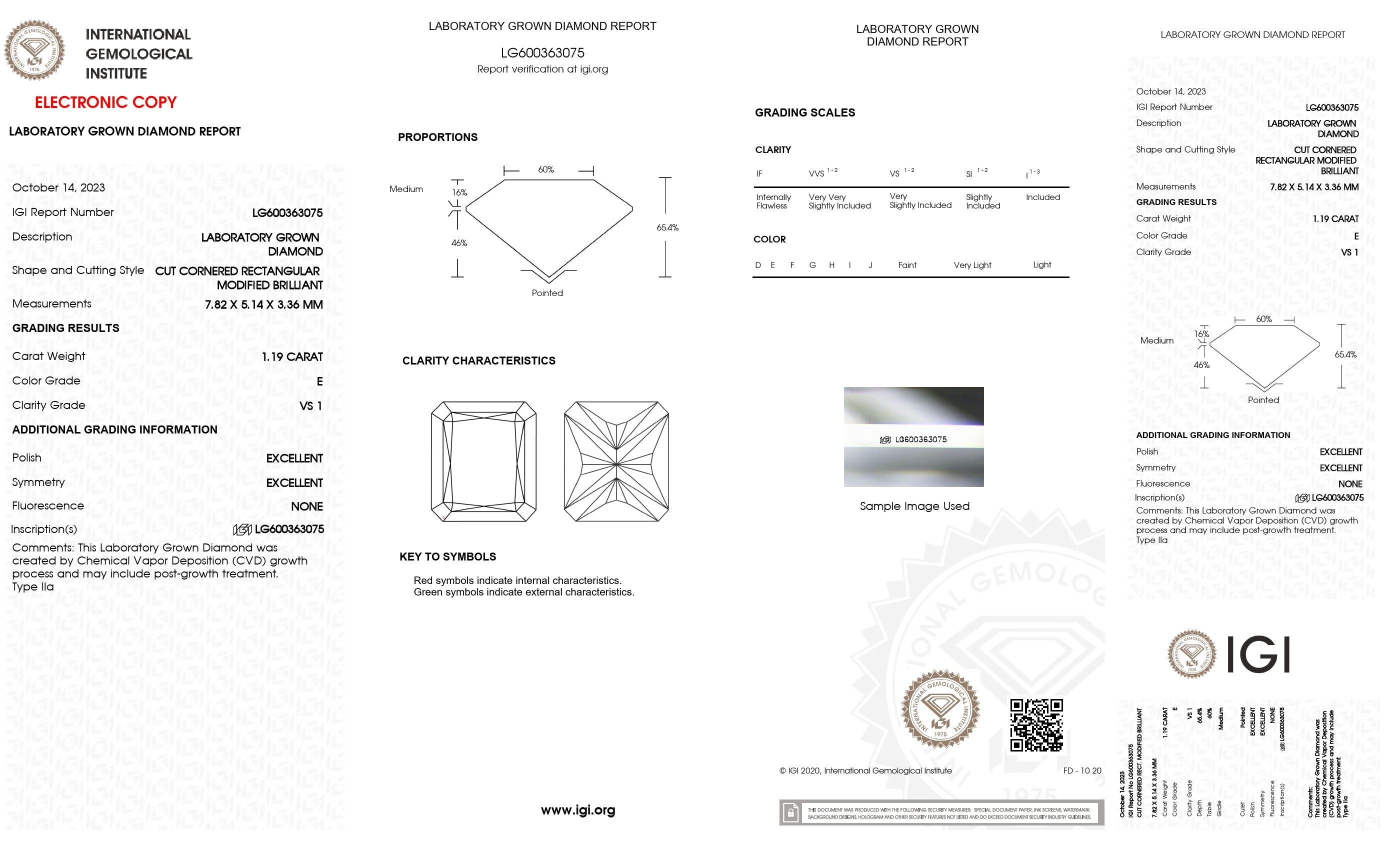 1.19 Ct. Radiant Wholesale IGI Certified Lab Grown Loose Diamond. (Clarity VS1 / E Color)