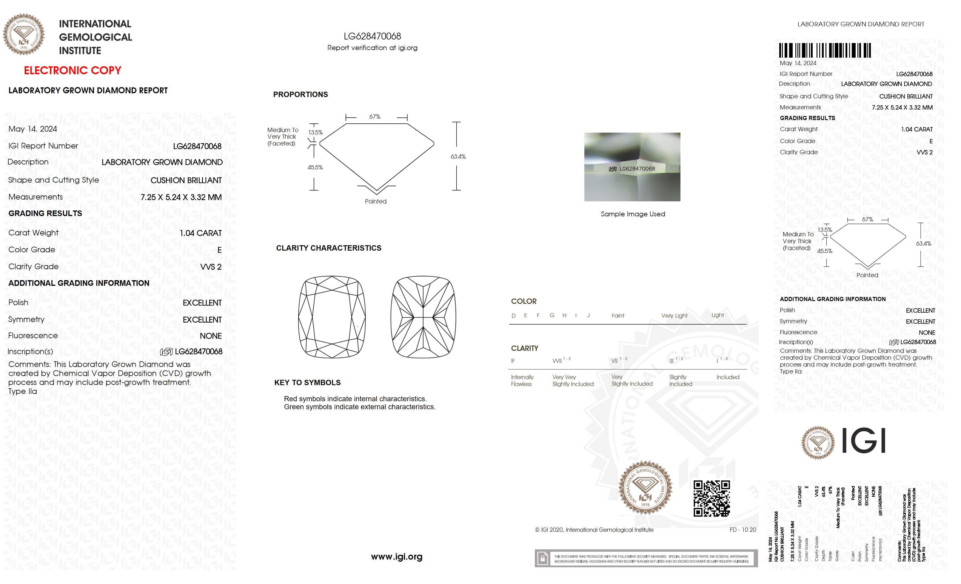 1.04 Ct. Cushion long Wholesale IGI Certified Lab Grown Loose Diamond. (Clarity VVS2 / E Color)