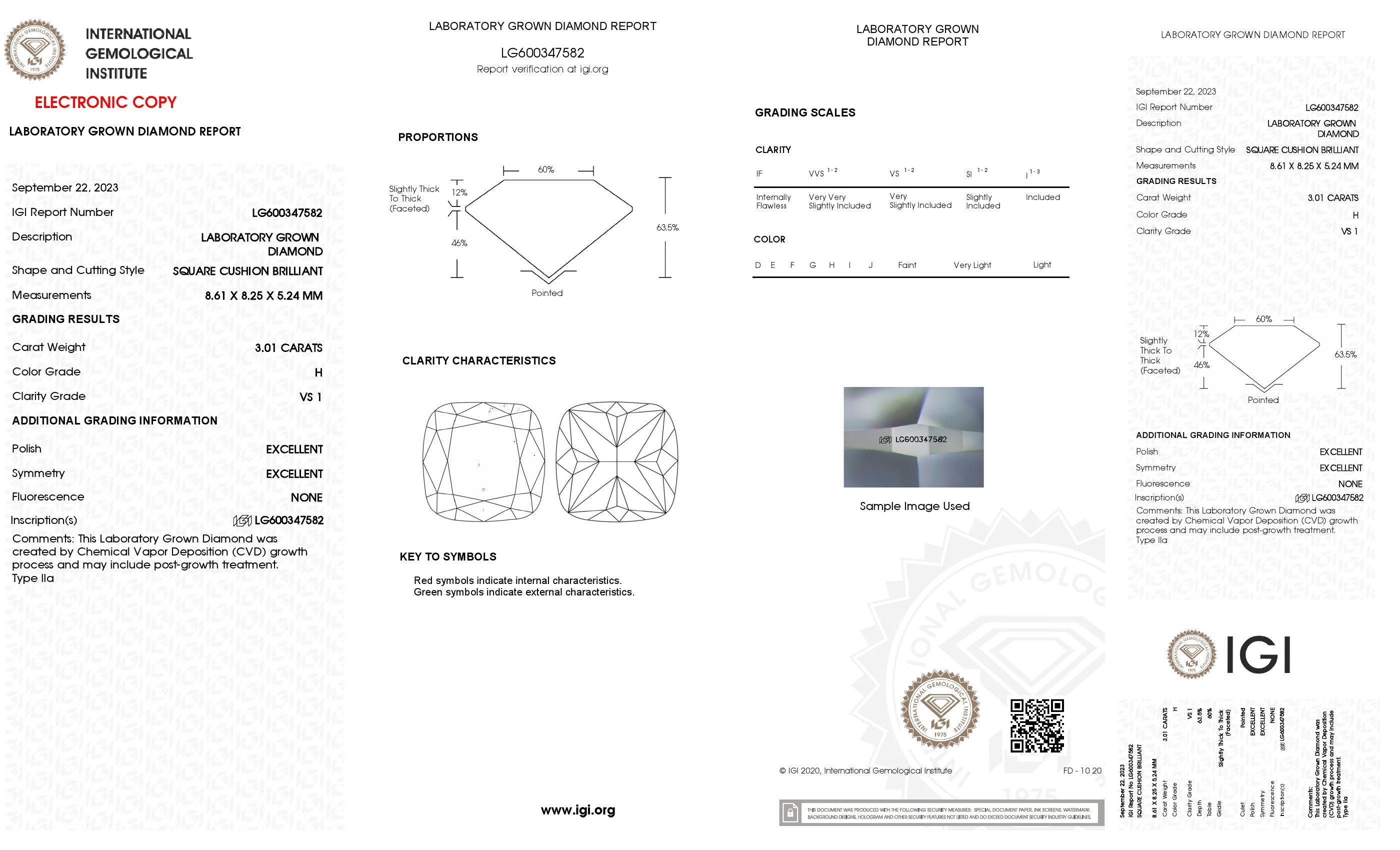 3.01 Ct. Cushion Wholesale IGI Certified Lab Grown Loose Diamond. (Clarity VS1 / H Color)