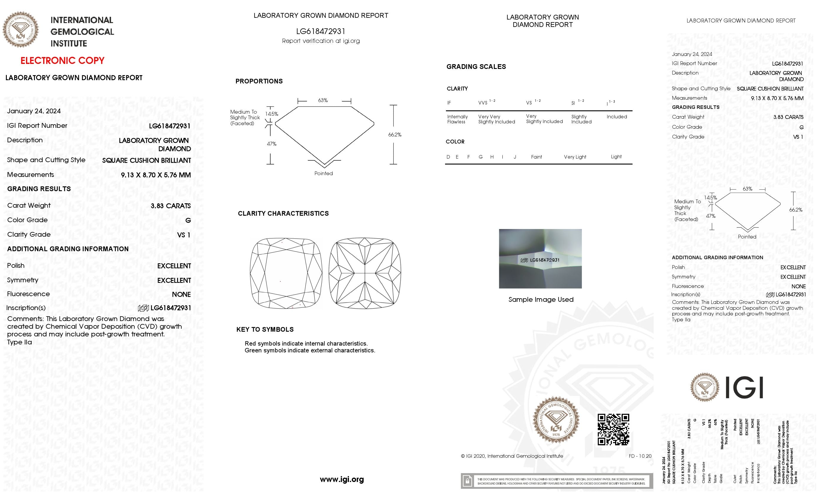 3.83 Ct. Cushion Wholesale IGI Certified Lab Grown Loose Diamond. (Clarity VS1 / G Color)