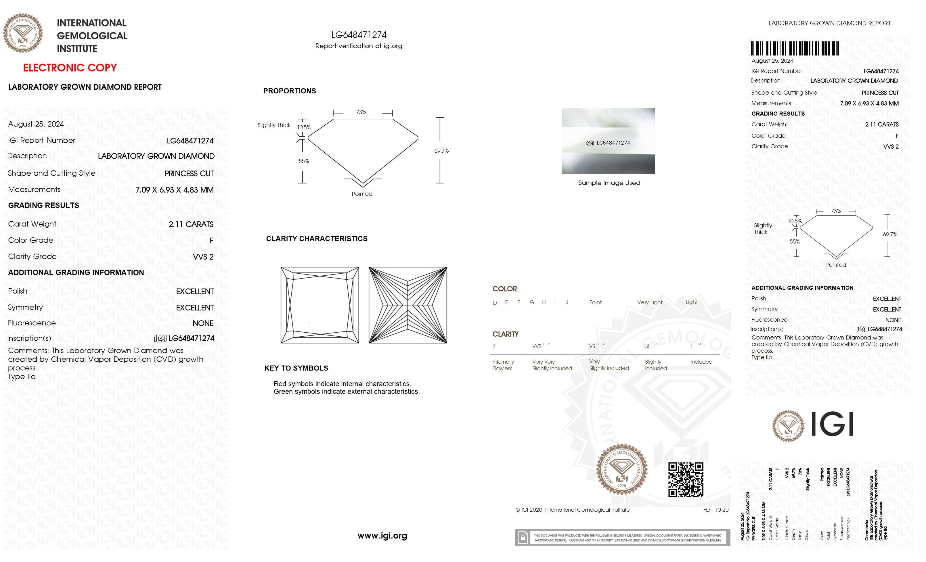 2.11 Ct. Princess Wholesale IGI Certified Lab Grown Loose Diamond. (Clarity VVS2 / F Color)